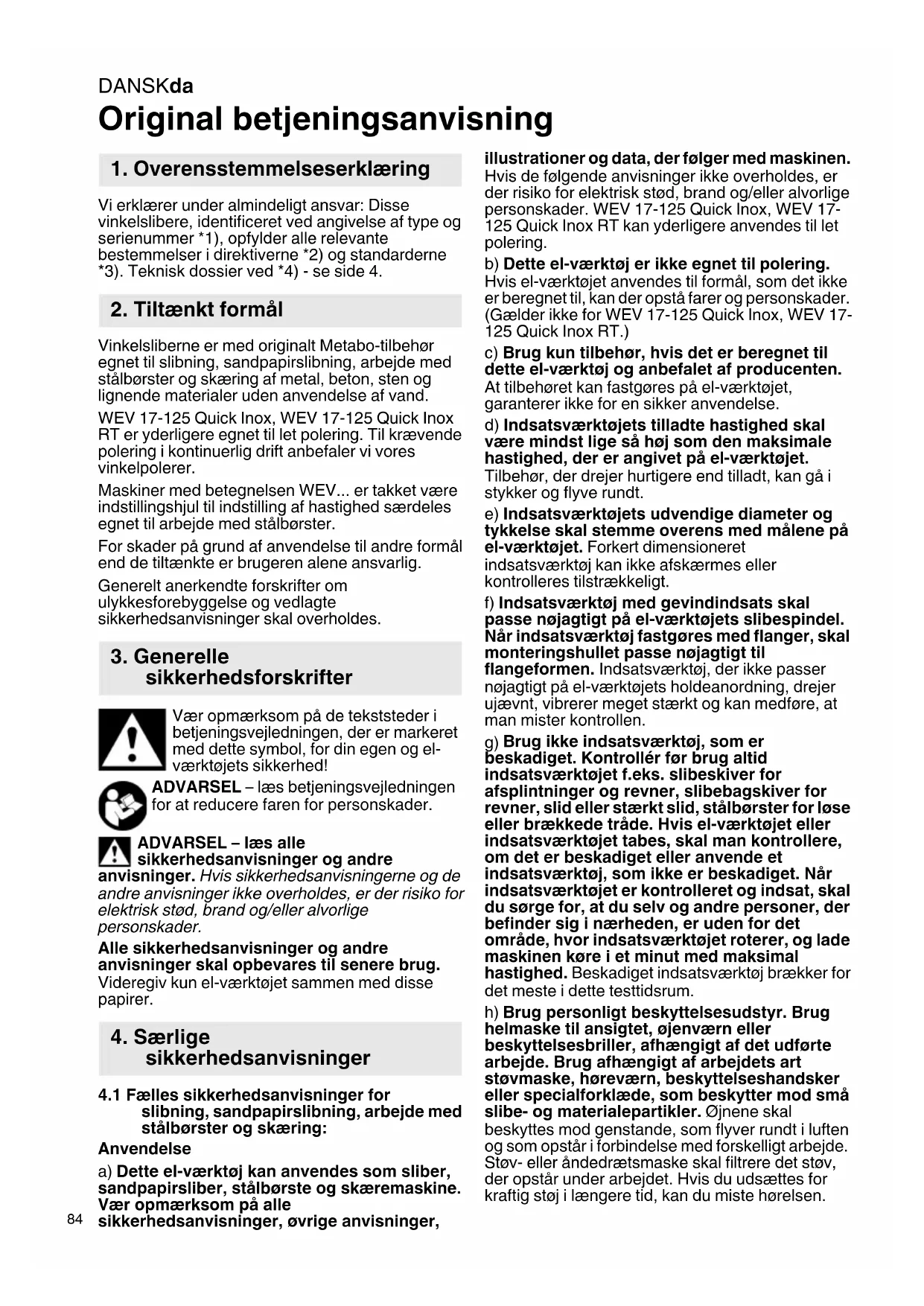 Original betjeningsanvisning Vi erklærer under almindeligt ansvar: Disse vinkelslibere, identificeret ved angivelse af type og serienummer *1), opfylder alle relevante bestemmelser i direktiverne *2) og standarderne *3). Teknisk dossier ved *4) - se side 4. Vinkelsliberne er med originalt Metabo-tilbehør egnet til slibning, sandpapirslibning, arbejde med stålbørster og skæring af metal, beton, sten og lignende materialer uden anvendelse af vand. WEV 17-125 Quick Inox, WEV 17-125 Quick Inox RT er yderligere egnet til let polering. Til krævende polering i kontinuerlig drift anbefaler vi vores vinkelpolerer. Maskiner med betegnelsen WEV... er takket være indstillingshjul til indstilling af hastighed særdeles egnet til arbejde med stålbørster. For skader på grund af anvendelse til andre formål end de tiltænkte er brugeren alene ansvarlig. Generelt anerkendte forskrifter om ulykkesforebyggelse og vedlagte sikkerhedsanvisninger skal overholdes. Vær opmærksom på de tekststeder i betjeningsvejledningen, der er markeret med dette symbol, for din egen og el- værktøjets sikkerhed! ADVARSEL – læs betjeningsvejledningen for at reducere faren for personskader. ADVARSEL – læs alle sikkerhedsanvisninger og andre anvisninger. Hvis sikkerhedsanvisningerne og de andre anvisninger ikke overholdes, er der risiko for elektrisk stød, brand og/eller alvorlige personskader. Alle sikkerhedsanvisninger og andre anvisninger skal opbevares til senere brug. Videregiv kun el-værktøjet sammen med disse papirer.