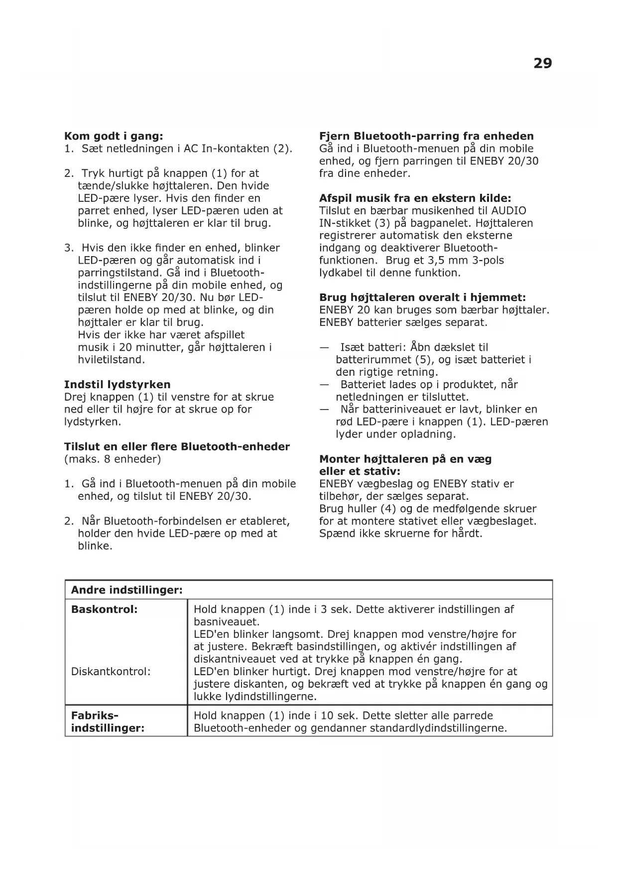 holder den hvide LED-pære op med at blinke. Fjern Bluetooth-parring fra enheden Gå ind i Bluetooth-menuen på din mobile enhed, og fjern parringen til ENEBY 20/30 fra dine enheder. Afspil musik fra en ekstern kilde: Tilslut en bærbar musikenhed til AUDIO IN-stikket (3) på bagpanelet. Højttaleren registrerer automatisk den eksterne indgang og deaktiverer Bluetooth- funktionen. Brug et 3,5 mm 3-pols lydkabel til denne funktion. Brug højttaleren overalt i hjemmet: ENEBY 20 kan bruges som bærbar højttaler. ENEBY batterier sælges separat. — Isæt batteri: Åbn dækslet til batterirummet (5), og isæt batteriet i den rigtige retning. — Batteriet lades op i produktet, når netledningen er tilsluttet. — Når batteriniveauet er lavt, blinker en rød LED-pære i knappen (1). LED-pæren lyder under opladning. Monter højttaleren på en væg eller et stativ: ENEBY vægbeslag og ENEBY stativ er tilbehør, der sælges separat. Brug huller (4) og de medfølgende skruer for at montere stativet eller vægbeslaget. Spænd ikke skruerne for hårdt. Andre indstillinger: Baskontrol: Diskantkontrol: Hold knappen (1) inde i 3 sek. Dette aktiverer indstillingen af basniveauet. LED'en blinker langsomt. Drej knappen mod venstre/højre for at justere. Bekræft basindstillingen, og aktivér indstillingen af diskantniveauet ved at trykke på knappen én gang. LED'en blinker hurtigt. Drej knappen mod venstre/højre for at justere diskanten, og bekræft ved at trykke på knappen én gang og lukke lydindstillingerne. Fabriks- indstillinger: Hold knappen (1) inde i 10 sek. Dette sletter alle parrede Bluetooth-enheder og gendanner standardlydindstillingerne.30 Sikkerhed og vigtige oplysninger ADVARSEL: — Risiko for overophedning! Produktet må aldrig installeres i et lukket område. Der skal altid være en afstand på mindst 5 mm omkring produktet til ventilation. Sørg for, at gardiner eller andre genstande aldrig tildækker ventilationsåbningerne på produktet. — Placer aldrig produktet eller batterierne i nærheden af åben ild eller andre varmekilder, herunder direkte sollys. — Produktet må kun bruges indendørs. Apparatet må ikke udsættes for dryp eller stænk, og genstande fyldt med væske, f.eks. vaser, må aldrig sættes på apparatet. — Produktet må aldrig placeres oven på andet elektrisk udstyr. — Kontakten eller apparatets stik skal bruges som koblingsanordning og skal altid være lettilgængelig. — Hvis tilslutningskablet er beskadiget, skal det udskiftes med et nyt ledningssæt, der er typegodkendt for dit land. — Batterier (i pakke eller installerede) må ikke udsættes for høj varme, f.eks. sol, ild eller lignende. VIGTIGT! — Højttaleren er kun til indendørs brug og må kun bruges i temperaturer fra 0-45º. — Lad ikke højttaleren stå i direkte sollys eller i nærheden af varmekilder, da den kan overophede. — Højttaleren må ikke udsættes for våde, fugtige eller meget støvede omgivelser, da den kan blive beskadiget. — Rækkevidden mellem højttaleren og modtageren måles i fri luft. — Forskellige bygningsmaterialer og enhedernes placering kan påvirke rækkevidden af den trådløse forbindelse. — For høj lydstyrke kan medføre høreskade. — De akustiske komponenter må ikke berøres. — Produktet må ikke bruges som hylde eller stativ. VEDLIGEHOLDELSE Højttaleren gøres ren ved at tørre den af med en fugtig klud. Højttaleren må aldrig nedsænkes i vand. BEMÆRK! Brug aldrig slibende rengøringsmidler eller kemiske opløsningsmidler, da det kan beskadige produktet.