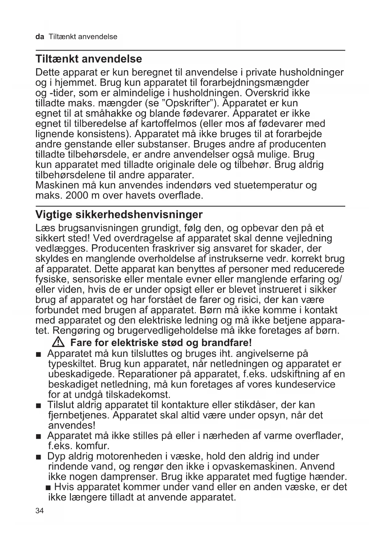 Gooi verpakkingsmateriaal op een milieuvriendelijke manier weg. Dit apparaat is gekenmerkt in overeen- stemming met de Europese richtlijn 2012/19/EU betreffende afgedankte elektrische en elektronische appara- tuur (waste electrical and electronic equipment – WEEE). De richtlijn geeft het kader aan voor de in de EU geldige terugneming en verwerking van oude apparaten. Raadpleeg uw gespecialiseerde handelaar voor de geldende voorschriften inzake afvalverwijdering. Garantie Voor dit apparaat gelden de garantievoor- waarden die worden uitgegeven door de vertegenwoordiging van ons bedrijf in het land van aankoop. De leverancier, bij wie u het apparaat heeft gekocht, geeft u hierover graag meer informatie. Om aanspraak te maken op de garantie heeft u altijd uw aankoopbewijs nodig. Wijzigingen voorbehouden.34 da Tiltænkt anvendelse Tiltænkt anvendelse Dette apparat er kun beregnet til anvendelse i private husholdninger og i hjemmet. Brug kun apparatet til forarbejdningsmængder og -tider, som er almindelige i husholdningen. Overskrid ikke tilladte maks. mængder (se ”Opskrifter”). Apparatet er kun egnet til at småhakke og blande fødevarer. Apparatet er ikke egnet til tilberedelse af kartoffelmos (eller mos af fødevarer med lignende konsistens). Apparatet må ikke bruges til at forarbejde andre genstande eller substanser. Bruges andre af producenten tilladte tilbehørsdele, er andre anvendelser også mulige. Brug kun apparatet med tilladte originale dele og tilbehør. Brug aldrig tilbehørsdelene til andre apparater. Maskinen må kun anvendes indendørs ved stuetemperatur og maks. 2000 m over havets overflade. Vigtige sikkerhedshenvisninger Læs brugsanvisningen grundigt, følg den, og opbevar den på et sikkert sted! Ved overdragelse af apparatet skal denne vejledning vedlægges. Producenten fraskriver sig ansvaret for skader, der skyldes en manglende overholdelse af instrukserne vedr. korrekt brug af apparatet. Dette apparat kan benyttes af personer med reducerede fysiske, sensoriske eller mentale evner eller manglende erfaring og/ eller viden, hvis de er under opsigt eller er blevet instrueret i sikker brug af apparatet og har forstået de farer og risici, der kan være forbundet med brugen af apparatet. Børn må ikke komme i kontakt med apparatet og den elektriske ledning og må ikke betjene appara- tet. Rengøring og brugervedligeholdelse må ikke foretages af børn. W Fare for elektriske stød og brandfare! ■ Apparatet må kun tilsluttes og bruges iht. angivelserne på typeskiltet. Brug kun apparatet, når netledningen og apparatet er ubeskadigede. Reparationer på apparatet, f.eks. udskiftning af en beskadiget netledning, må kun foretages af vores kundeservice for at undgå tilskadekomst. ■ Tilslut aldrig apparatet til kontakture eller stikdåser, der kan fjernbetjenes. Apparatet skal altid være under opsyn, når det anvendes! ■ Apparatet må ikke stilles på eller i nærheden af varme overflader, f.eks. komfur. ■ Dyp aldrig motorenheden i væske, hold den aldrig ind under rindende vand, og rengør den ikke i opvaskemaskinen. Anvend ikke nogen damprenser. Brug ikke apparatet med fugtige hænder. ■ Hvis apparatet kommer under vand eller en anden væske, er det ikke længere tilladt at anvende apparatet.35
