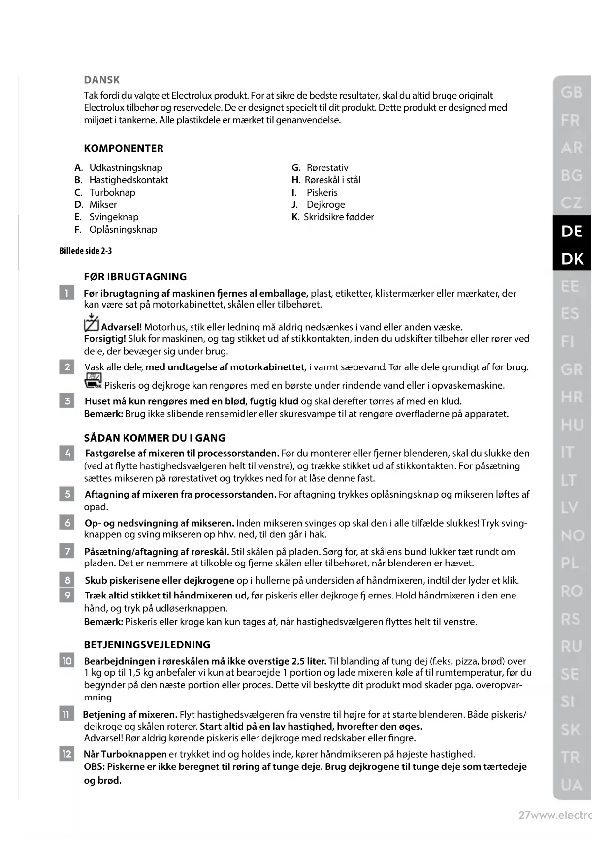 4 Fastgørelse af mixeren til processorstanden. Før du monterer eller erner blenderen, skal du slukke den (ved at ytte hastighedsvælgeren helt til venstre), og trække stikket ud af stikkontakten. For påsætning sættes mikseren på rørestativet og trykkes ned for at låse denne fast. 5 Aftagning af mixeren fra processorstanden. For aftagning trykkes oplåsningsknap og mikseren løftes af opad. 6 Op- og nedsvingning af mikseren. Inden mikseren svinges op skal den i alle tilfælde slukkes! Tryk sving- knappen og sving mikseren op hhv. ned, til den går i hak. 7 Påsætning/aftagning af røreskål. Stil skålen på pladen. Sørg for, at skålens bund lukker tæt rundt om pladen. Det er nemmere at tilkoble og erne skålen eller tilbehøret, når blenderen er hævet. 8 Skub piskerisene eller dejkrogene op i hullerne på undersiden af håndmixeren, indtil der lyder et klik. 9 Træk altid stikket til håndmixeren ud, før piskeris eller dejkroge ernes. Hold håndmixeren i den ene hånd, og tryk på udløserknappen. Bemærk: Piskeris eller kroge kan kun tages af, når hastighedsvælgeren yttes helt til venstre. BETJENINGSVEJLEDNING 10 Bearbejdningen i røreskålen må ikke overstige 2,5 liter. Til blanding af tung dej (f.eks. pizza, brød) over 1 kg op til 1,5 kg anbefaler vi kun at bearbejde 1 portion og lade mixeren køle af til rumtemperatur, før du begynder på den næste portion eller proces. Dette vil beskytte dit produkt mod skader pga. overopvar- mning 11 Betjening af mixeren. Flyt hastighedsvælgeren fra venstre til højre for at starte blenderen. Både piskeris/ dejkroge og skålen roterer. Start altid på en lav hastighed, hvorefter den øges. Advarsel! Rør aldrig kørende piskeris eller dejkroge med redskaber eller ngre. 12 Når Turboknappen er trykket ind og holdes inde, kører håndmikseren på højeste hastighed. OBS: Piskerne er ikke beregnet til røring af tunge deje. Brug dejkrogene til tunge deje som tærtedeje og brød.28www.electrolux.com