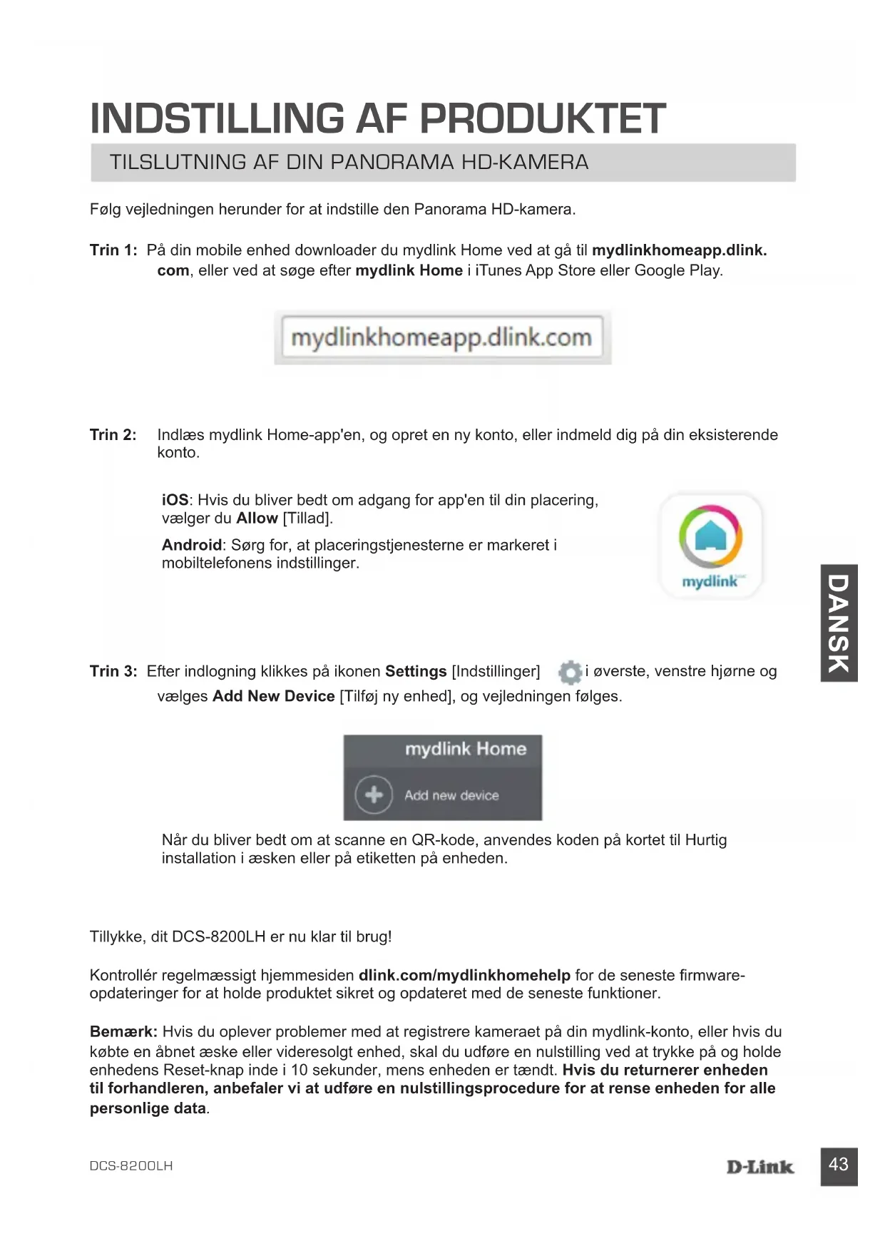 DANSK Tillykke, dit DCS-8200LH er nu klar til brug! Kontrollér regelmæssigt hjemmesiden dlink.com/mydlinkhomehelp for de seneste rmware- opdateringer for at holde produktet sikret og opdateret med de seneste funktioner. Bemærk: Hvis du oplever problemer med at registrere kameraet på din mydlink-konto, eller hvis du købte en åbnet æske eller videresolgt enhed, skal du udføre en nulstilling ved at trykke på og holde enhedens Reset-knap inde i 10 sekunder, mens enheden er tændt. Hvis du returnerer enheden til forhandleren, anbefaler vi at udføre en nulstillingsprocedure for at rense enheden for alle personlige data. Følg vejledningen herunder for at indstille den Panorama HD-kamera. Trin 1: På din mobile enhed downloader du mydlink Home ved at gå til mydlinkhomeapp.dlink. com, eller ved at søge efter mydlink Home i iTunes App Store eller Google Play. Trin 2: Indlæs mydlink Home-app'en, og opret en ny konto, eller indmeld dig på din eksisterende konto. iOS: Hvis du bliver bedt om adgang for app'en til din placering, vælger du Allow [Tillad]. Android: Sørg for, at placeringstjenesterne er markeret i mobiltelefonens indstillinger. Trin 3: Efter indlogning klikkes på ikonen Settings [Indstillinger] i øverste, venstre hjørne og vælges Add New Device [Tilføj ny enhed], og vejledningen følges. Når du bliver bedt om at scanne en QR-kode, anvendes koden på kortet til Hurtig installation i æsken eller på etiketten på enheden.