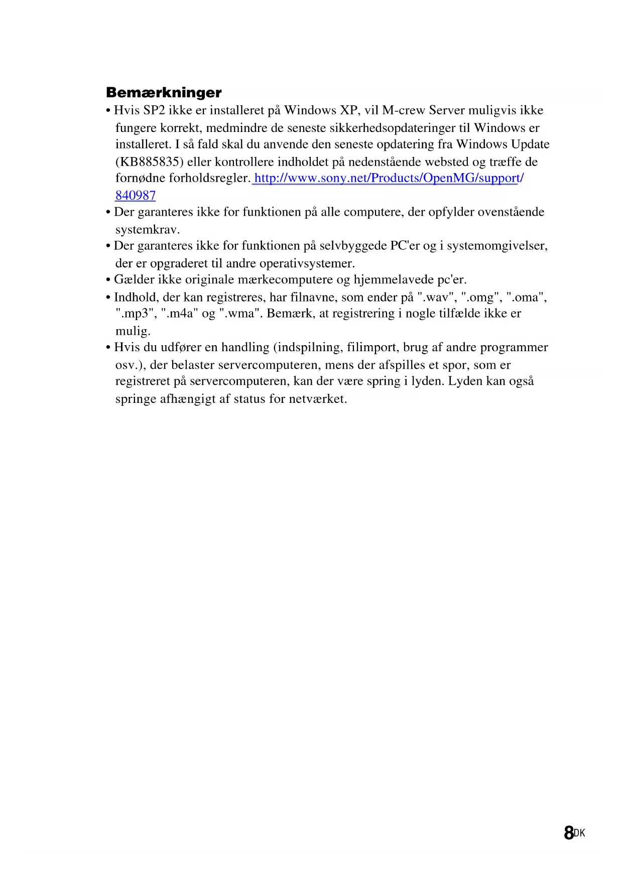 Hvis SP2 ikke er installereret på Windows XP, vil M-crew Server muligvis ikke fungere korrekt, medmindre de seneste sikkerhedsopdateringer til Windows er installereret. Ialand skal du anvende den seneste opdatering fra Windows Update (KB885835) eller kontrollere indholdet på nedenstående websted og træffe de fornødne forholdsregler. http://www.sony.net/Products/OpenMG/support/840987/
