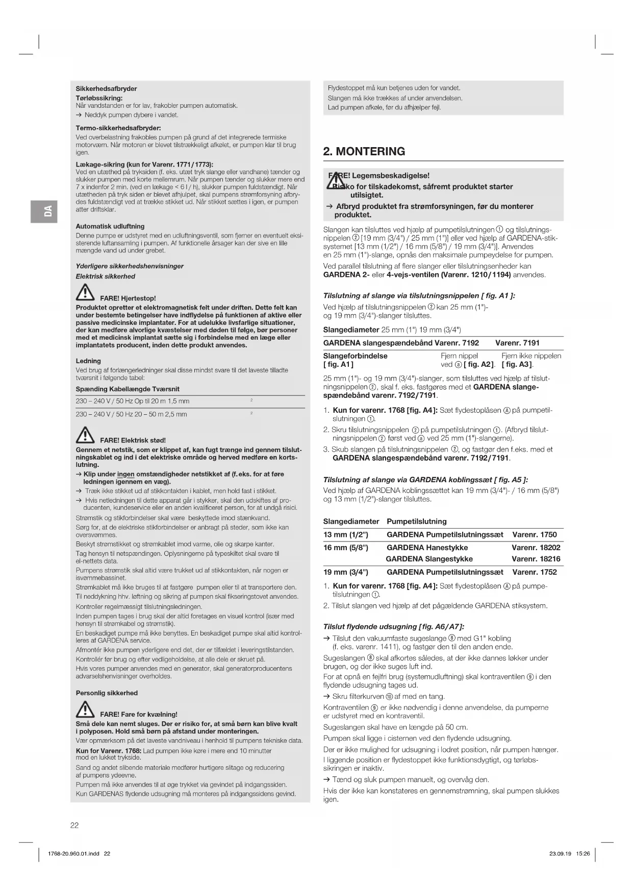 FARE! Elektrisk stød! Gennem et netstik, som er klippet af, kan fugt trænge ind gennem tilslut- ningskablet og ind i det elektriske område og herved medføre en korts- lutning. v Klip under ingen omstændigheder netstikket af (f. eks. for at føre ledningen igennem en væg). v Træk ikke stikket ud af stikkontakten i kablet, men hold fast i stikket. v Hvis netledningen til dette apparat går i stykker, skal den udskiftes af pro- ducenten, kundeservice eller en anden kvalificeret person, for at undgå risici. Strømstik og stikforbindelser skal være beskyttede imod stænkvand. Sørg for, at de elektriske stikforbindelser er anbragt på steder, som ikke kan over svømmes. Beskyt strømstikket og strømkablet imod varme, olie og skarpe kanter. Tag hensyn til netspændingen. Oplysningerne på typeskiltet skal svare til el-nettets data. Pumpens strømstik skal altid være trukket ud af stikkontakten, når nogen er i svømme bassinet. Strømkablet må ikke bruges til at fastgøre pumpen eller til at transportere den. Til neddykning hhv. løftning og sikring af pumpen skal fikseringstovet anvendes. Kontroller regelmæssigt tilslutningsledningen. Inden pumpen tages i brug skal der altid foretages en visuel kontrol (især med hensyn til strømkabel og strømstik). En beskadiget pumpe må ikke benyttes. En beskadiget pumpe skal altid kontrol- leres af GARDENA service. Afmontér ikke pumpen yderligere end det, der er tilfældet i leveringstilstanden. Kontrollér før brug og efter vedligeholdelse, at alle dele er skruet på. Hvis vores pumper anvendes med en generator, skal generatorproducentens advarselshenvisninger overholdes. Personlig sikkerhed FARE! Fare for kvælning! Små dele kan nemt sluges. Der er risiko for, at små børn kan blive kvalt i polyposen. Hold små børn på afstand under monteringen. Vær opmærksom på det laveste vandniveau i henhold til pumpens tekniske data. Kun for Varenr. 1768: Lad pumpen ikke køre i mere end 10 minutter mod en lukket trykside. Sand og andet slibende materiale medfører hurtigere slitage og reducering af pumpens ydeevne. Pumpen må ikke anvendes til at øge trykket via gevindet på indgangssiden. Kun GARDENAS flydende udsugning må monteres på indgangssidens gevind.