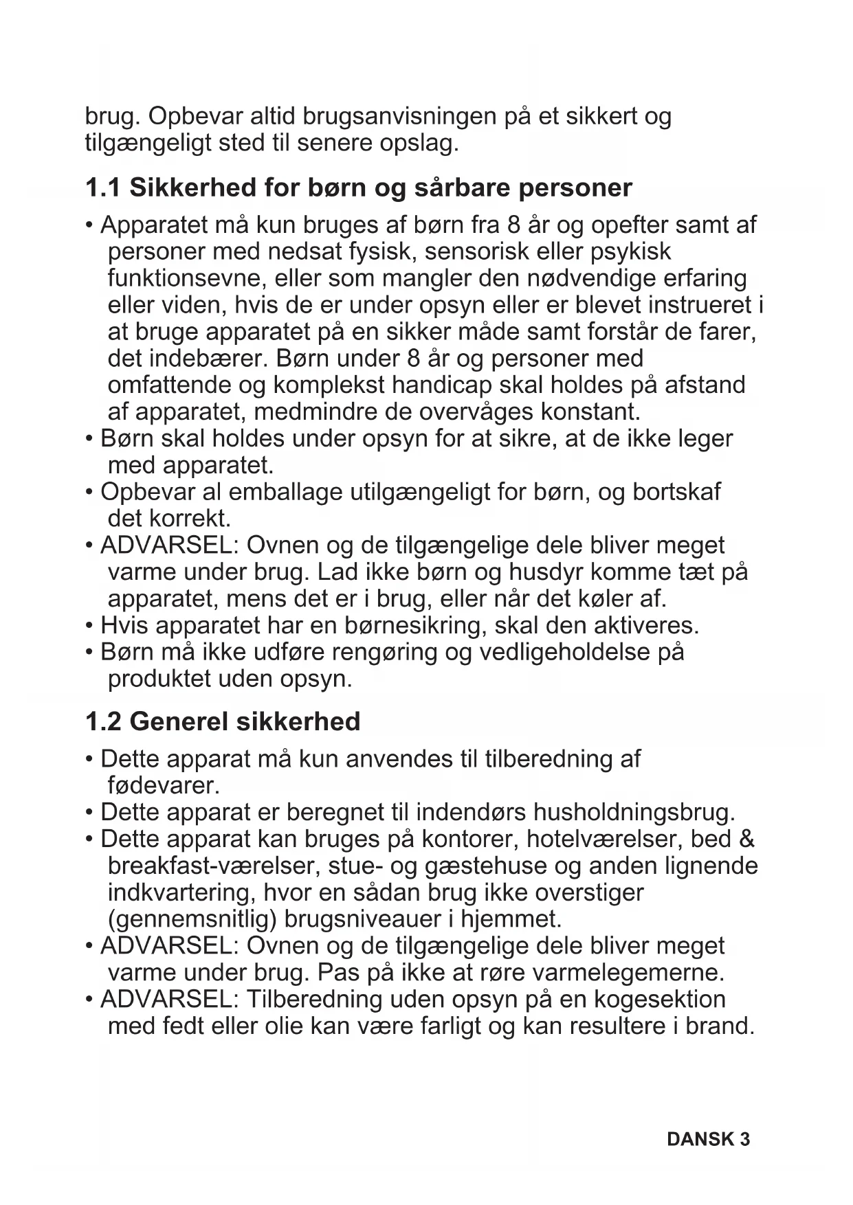 - ADVARSEL: Ovnen og de tilgængelige dele bliver meget varme under brug. Lad ikke børn og husdyr komme tæt på apparatet, mens det er i brug, eller når det køler af.