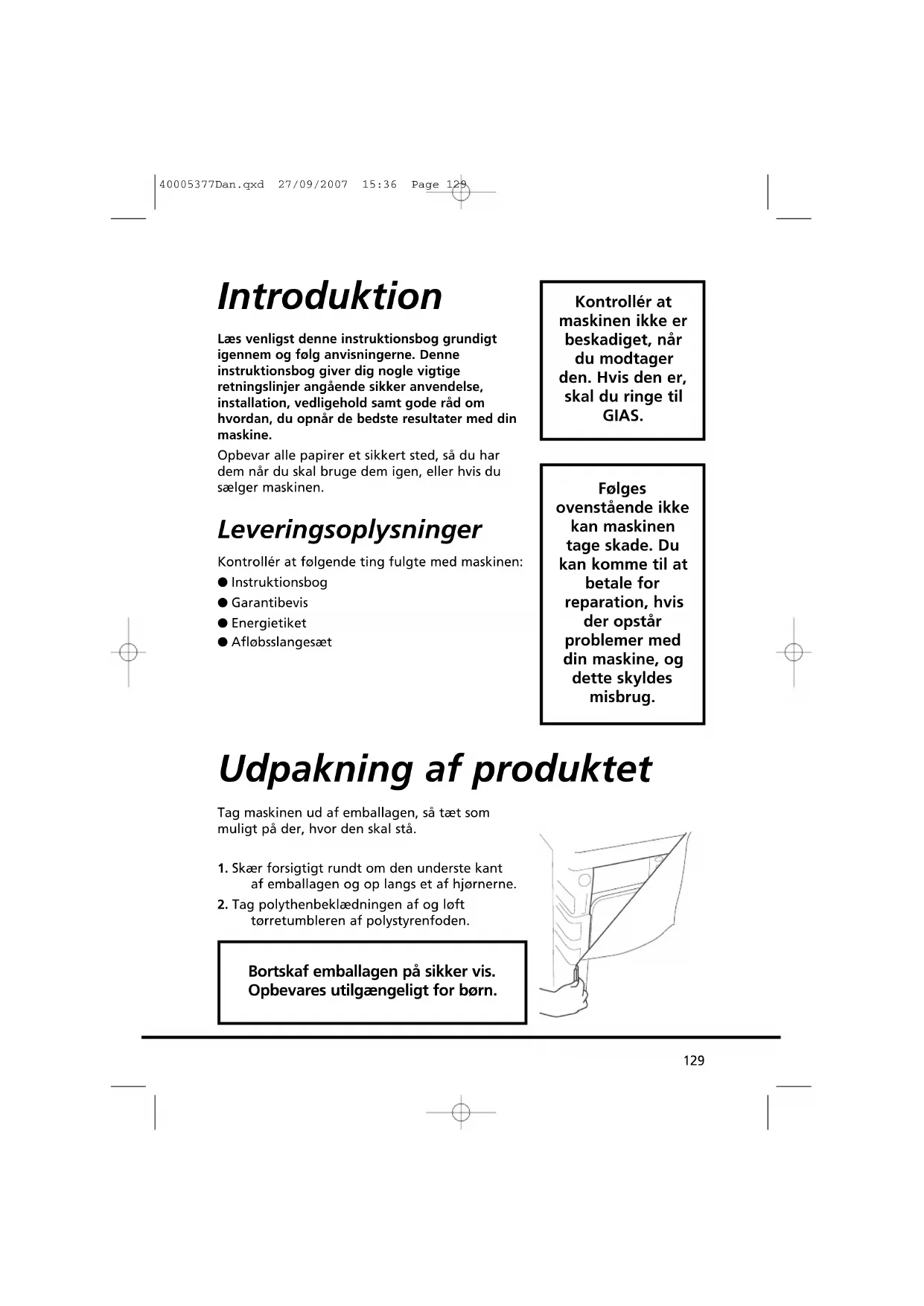 Kontrollér at maskinen ikke er beskadiget, når du modtager den. Hvis den er, skal du ringe til GIAS. Følges ovenstående ikke kan maskinen tage skade. Du kan komme til at betale for reparation, hvis der opstår problemer med din maskine, og dette skyldes misbrug. Udpakning af produktet Bortskaf emballagen på sikker vis. Opbevares utilgængeligt for børn. 40005377Dan.qxd 27/09/2007 15:36 Page 129Sikkerhedspåmindelser Installation ● Kontroller at produktet ikke viser tegn på beskadigelse – før det tages i brug. Er det beskadiget må det ikke bruges og GIAS Service skal kontaktes. ● Der må ikke anvendes adaptere, flere stikdåser og/eller forlængerledninger. ● Tørretumbleren må aldrig installeres opad gardiner, og genstande skal forhindres i at falde ned bag ved eller samles bag tørretumbleren. ● Maskinen må ikke installeres bag en dør, der kan låses, bag en skydedør eller bag en dør, hvor hængslet sidder i modsatte side af tørretumblerens hængsel. Anvendelse ● Maskinen er ikke beregnet til at blive benyttet af personer (herunder også børn) med mindskede fysiske, sensoriske eller mentale evner, eller af personer, der mangler erfaring og viden, medmindre den person, der er ansvarlig for deres sikkerhed har observeret dem eller har instrueret dem i, hvordan maskinen benyttes. ● Børn skal være under opsyn af en voksen for at sikre, at de ikke leger med maskinen. ● ADVARSEL Misbrug af tørretumbleren kan medføre brandfare. ● Maskinen er kun til husholdningsbrug, dvs. til at tørring af tekstilvarer og tøj i en husholdning. ● Denne maskine må kun anvendes til det tilsigtede formål som beskrevet i denne håndbog. Husk at alle instruktioner vedr. installation og anvendelse skal både læses og forstås før maskinen tages i brug. ● Undgå at røre ved maskinen med fugtige eller våde hænder og fødder. ● Man må ikke læne sig op af lågen, når der lægges tøj i maskinen, eller bruge lågen til at løfte eller flytte maskinen. ● Børn må ikke lege med maskinen og dens knapper. ● ADVARSEL Produktet må ikke bruges hvis fnugfilteret sidder forkert eller er beskadiget; fnug kan antændes. ● ADVARSEL Der hvor symbolet for varm overflade er placeret , kan temperaturen, under tumbling, overstige 60 grader C. ● Tag stikket ud at kontakten. Tag altid stikket ud før apparatet rengøres. ● Maskinen må ikke anvendes, hvis den virker defekt. ● Bomuldsfibre og fnug må ikke ophobes på gulvet omkring maskinen. ● Tromlens inderside kan være meget varm. Lad altid tørretumbleren fuldføre afkølingsperioden før tøjet tages ud. Vasketøjet ● Unlad at tørre uvaskede ting i tørretumbleren. ● ADVARSEL Man må ikke tørretumble tørt stof behandlet med kemiske rensevæsker. ● ADVARSEL Skumgummimateriale kan, under visse omstændigheder, selvantænde, hvis det bliver for varmt. Skumgummi (latex skum), badehætter, vandafvisende tekstiler, materialer med gummibehandlet bagside og tøj eller puder med