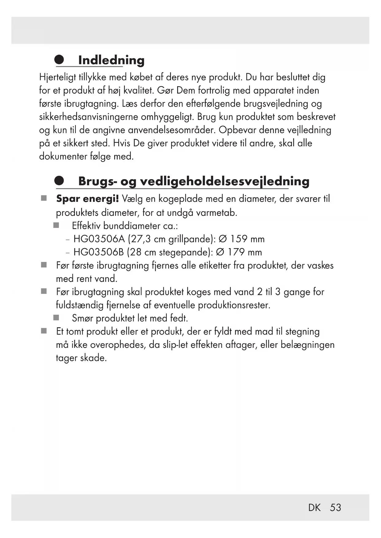 Indledning Hjerteligt tillykke med købet af deres nye produkt. Du har besluttet dig for et produkt af høj kvalitet. Gør Dem fortrolig med apparatet inden første ibrugtagning. Læs derfor den efterfølgende brugsvejledning og sikkerhedsanvisningerne omhyggeligt. Brug kun produktet som beskrevet og kun til de angivne anvendelsesområder. Opbevar denne vejlledning på et sikkert sted. Hvis De giver produktet videre til andre, skal alle dokumenter følge med. Brugs- og vedligeholdelsesvejledning Spar energi! Vælg en kogeplade med en diameter, der svarer til produktets diameter, for at undgå varmetab. Effektiv bunddiameter ca.: – HG03506A (27,3 cm grillpande): Ø 159 mm – HG03506B (28 cm stegepande): Ø 179 mm Før første ibrugtagning fjernes alle etiketter fra produktet, der vaskes med rent vand. Før ibrugtagning skal produktet koges med vand 2til3gange for fuldstændig fjernelse af eventuelle produktionsrester. Smør produktet let med fedt. Et tomt produkt eller et produkt, der er fyldt med mad til stegning må ikke overophedes, da slip-let effekten aftager, eller belægningen tager skade.54 DK Overophedningsfare! På overophedede pander uden fedtstof kan der forekomme misfarvninger af non-stick belægningen, når der forbrændes proteiner ved kontakt med fedtfattige madvarer. Disse misfarvninger skal betragtes som tegn på brug og har ingen indflydelse på belægningens kvalitet og brugsegenskaberne. Opvarm mad, der skal koges, ved høj/middel varme, og lad det koge færdigt på et lavere trin. Produktet skal altid være under opsyn, mens fedtet varmes op: Overophedet fedt kan antænde. Brændende fedt må aldrig slukkes med vand! Ilden slukkes med et låg eller et tykt tæppe. Anvend kun køkkenredskaber af plast eller træ for ikke at beskadige slip let-belægningen. Madvarer må ikke udskæres direkte i produktet. Læg ikke dryppende vådt kød i produktet. Hvis der sprøjter fedt på en varm kogeplade kan der nemt opstå en brand. Ved madlavning kan håndtaget blive varmt. Anvend grydelapper eller grillhandsker som beskyttelse. Produktet er egnet til gas-, el-, glaskeramik-, induktions-, og halogenkogeplader.55DK Vejledning for induktionskogeplader: Under visse omstændigheder kan der forekomme støj pga. varmekildens og produktets elektromagnetiske egenskaber. Dette er helt normalt og ikke et tegn på defekt induktionskogeplade eller produkt. Produktet skal placeres midt på induktionskogepladen. OBS! Hurtig opvarmningshastighed! Sørg for ikke at overophede produktet under opvarmning. Efter en overophedning af produktet skal lokalet udluftes grundigt. Dette produkt kombinerer fordelene ved aluminiumskogegrej, som for eksempel den lave vægt og den høje varmeledningsevne, med fordelene ved at lave mad med induktion. For at gøre dette muligt er der indbygget et magnetisk stålelement i aluminiumsbunden. Bunden er ikke magnetisk over hele fladen, og det kan derfor forekomme at induktionsspolen ikke reagerer, hvis induktionskogefeltet er tydeligt større end bunddiameteren. Dette er ikke en kvalitetsmangel og har ingen indflydelse på funktionaliteten. For at produktet virker korrekt, skal du altid stille det på en kogeplade, som svarer til den effektive bunddiameter, der er angivet i denne vejledning. Høje temperaturer kan misfarve produktets yderside. Dette er ikke en materialefejl og har ingen indflydelse på produktets kvalitet eller funktion. Et opvarmet produkt må aldrig holdes under rindende koldt vand. Herved kan produktets underside tage skade eller falde af produktet.56 DK Produktet er egnet til at holde tilberedt mad varm i en ovn (maks.160 °C i1time). Produktet er egnet til opvaskemaskine. Ved opvask i hånden anvendes varmt vand og almindeligt opvaskemiddel. Undgå at anvende skarpe og spidse genstande eller børster for ikke at beskadige materialet. Anvend ikke skrappe skuremidler til rengøring. Hyppig rengøring med skrappe rengøringsmidler kan medføre skader og/eller misfarvning af produktet. Opvask i opvaskemaskine kan medføre misfarvning af aluminiumsdelene. OBS! RIDSER! Undgå at skubbe og trække produktet på glaskeramiske kogeplader! Før madlavningen påbegyndes, anbefaler vi, at kogepladens overflade og produktets bund rengøres med en ren, fnugfri klud (fxmikrofiber). Herved kan ridser forebygges. Levnedsmiddelsikker: Dette produkt påvirker ikke de tilberedte madvarers smag og lugt. Anvend ikke produktet hvis håndtaget sidder løst. Efterspænd evt. håndtagets skruer. Bortskaffelse Indpakningen består af miljøvenlige materialer, som De kan bortskaffe over de lokale genbrugssteder. De får oplyst muligheder til bortskaffelse af det udtjente produkt hos deres lokale myndigheder eller bystyre.57DK Garanti Produktet blev produceret omhyggeligt efter de strengeste kvalitetskrav og kontrolleret grundigt inden levering. Hvis der forekommer mangler ved dette produkt, så har de juridiske rettigheder over for sælgeren af dette produkt. Disse juridiske rettigheder indskrænkes ikke af vores garanti, der beskrives i det følgende. De får 3 års garanti fra købsdatoen på dette produkt. Garantifristen begynder med købsdatoen. Opbevar den originale kassebon på et sikkert sted. Denne kassebon behøves som dokumentation for købet. Hvis der inden for 3 år fra købsdatoen af for dette produkt opstår en materiale- eller fabrikationsfejl, bliver produktet repareret eller erstattet – efter vores valg – af os uden omkostninger for dem. Garantien bortfalder, hvis produktet bliver beskadiget eller ikke anvendes eller vedligeholdes korrekt. Garantien gælder for materiale- eller fabrikationsfejl. Denne garanti dækker ikke produktdele, som er udsat for normalt slid og derfor kan betragtes som normale sliddele (f.eks. batterier) eller ved skader på skrøbelige dele; f.eks. kontakter, akkumulatorer som er fremstillet af glas.58 DK Afvikling af garantisager For at kunne garantere en hurtig sagsbehandling af deres forespørgsel, bedes De følge følge