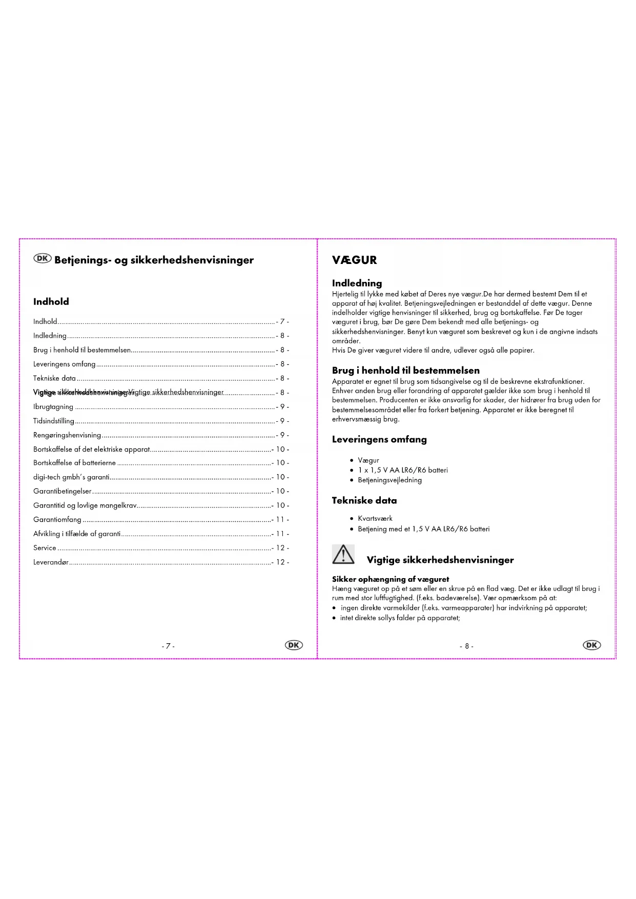 Bortskaffelse af det elektriske apparat Dette elektriske apparat må ikke bortskaffes i den normale husholdningsaffald. Bortskaf det elektriske apparat via et autoriseret affaldsbehandlingsfirma eller via Deres kommunale affaldsbehandlingsfacilitet. Venligst tag hensyn til aktuel gældende reglementer. I tvivlstilfælde bedes De sætte Dem i forbindelse med Deres affaldsbehandlingsfacilitet. Bortskaffelse af batterierne Vær venlig at deponere Deres batterier saglig korrekt i de i handelen specielt hertil opstillede beholdere. Batterier bør ikke deponeres i husholdningsaffald. Bortskaf venligst batterier via et autoriseret affaldsbehandlingsfirma eller via Deres kommunale affaldsbehandlingsfacilitet. Venligst tag hensyn til aktuel gældende reglementer. I tvivlstilfælde bedes De sætte Dem i forbindelse med Deres affaldsbehandlingsfacilitet. digi-tech gmbh’s garanti På dette apparat får De 3 års garanti fra købsdagen. Hvis der skulle optræde mangler med dette produkt, tilkommer Dem lovlige retter mod sælgeren af produktet. Disse lovlige retter indskrænkes ikke gennem vores garanti som skildret i det følgende. Garantibetingelser Garantifristen begynder med købsdatoen. De bedes venligst opbevare den originale kassebon omhyggeligt. Dette bilag bruges som bevis på købet. Hvis der inden for tre år fra købsdagen af dette produkt optræder en material- eller fabrikationsfejl, repareres eller erstattes – efter vores bedømmelse - produktet af os gratis for Dem. Denne garantiydelse forudsætter at det defekte apparat og købsbilaget (kassebon) fremlægges med en kort beskrivelse af mangelen og hvornår den er opstået. Hvis defekten dækkes af vores garanti, får De det reparerede eller et nyt produkt tilbage. Med reparatur eller ombytning af produktet indledes ikke et nyt garantitidsrum. Garantitid og lovlige mangelkrav Garantitiden forlænges ikke ved ydelse af garanti. Dette gælder også for erstattede og reparerede dele. Skader og mangler der eventuelt var forhånden ved købet, skal meldes straks efter udpakningen. Opståede reparationer efter udløbet af garantitiden skal betales.-