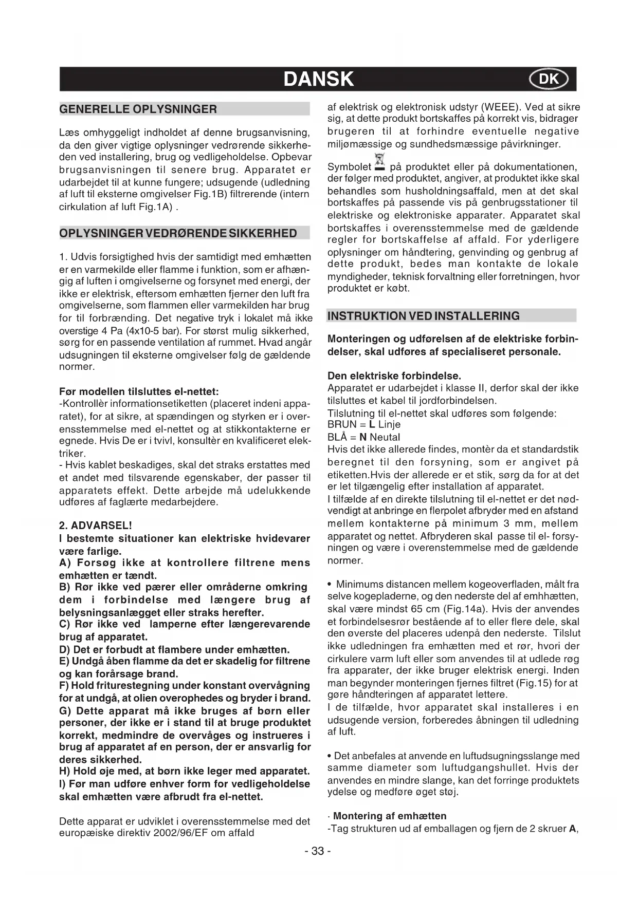 GENERELLE OPLYSNINGER Læs omhyggeligt indholdet af denne brugsanvisning, da den giver vigtige oplysninger vedrørende sikkerhe- den ved installering, brug og vedligeholdelse. Opbevar brugsanvisningen til senere brug. Apparatet er udarbejdet til at kunne fungere; udsugende (udledning af luft til eksterne omgivelser Fig.1B) filtrerende (intern cirkulation af luft Fig.1A) .