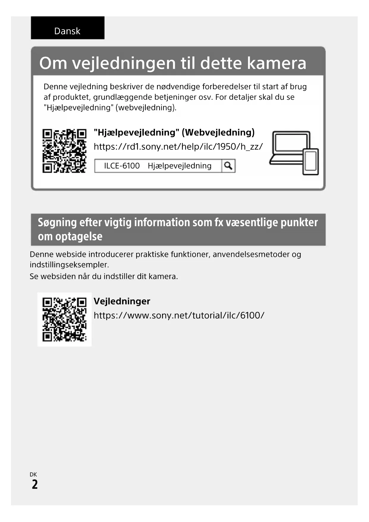 \\Win-473\camera\CX88400(PD)\Multi\06_Compose\5009876411_14lang\5009876411ILCE6100CEC\14DK-ILCE6100CEC\14DK.indd DTP data saved: 2019/07/16 15:25 PDF file created: 2019/07/31 09:24 Søgning efter vigtig information som fx væsentlige punkter om optagelse Denne webside introducerer praktiske funktioner, anvendelsesmetoder og indstillingseksempler.Se websiden når du indstiller dit kamera. Om vejledningen til dette kamera Denne vejledning beskriver de nødvendige forberedelser til start af brug af produktet, grundlæggende betjeninger osv. For detaljer skal du se "Hjælpevejledning" (webvejledning). https://rd1.sony.net/help/ilc/1950/h_zz/ "Hjælpevejledning" (Webvejledning) ILCE-6100 Hjælpevejledning Vejledninger https://www.sony.net/tutorial/ilc/6100/ DanskILCE-61005-009-876-41(1)
