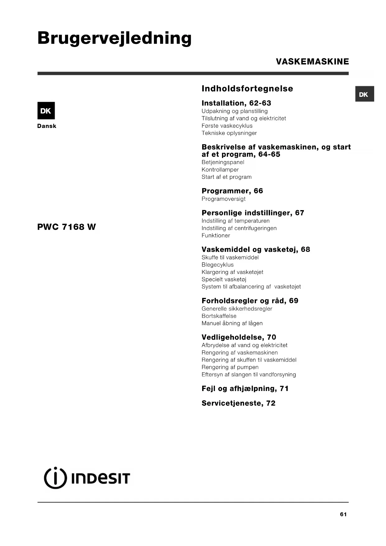 Dansk Indholdsfortegnelse Installation, 62-63 Udpakning og planstilling Tilslutning af vand og elektricitet Første vaskecyklus Tekniske oplysninger Beskrivelse af vaskemaskinen, og start af et program, 64-65 Betjeningspanel Kontrollamper Start af et program Programmer, 66 Programoversigt Personlige indstillinger, 67 Indstilling af temperaturen Indstilling af centrifugeringen Funktioner Vaskemiddel og vasketøj, 68 Skuffe til vaskemiddel Blegecyklus Klargøring af vasketøjet Specielt vasketøj System til afbalancering af vasketøjet Forholdsregler og råd, 69 Generelle sikkerhedsregler Bortskaffelse Manuel åbning af lågen Vedligeholdelse, 70 Afbrydelse af vand og elektricitet Rengøring af vaskemaskinen Rengøring af skuffen til vaskemiddel Rengøring af pumpen Eftersyn af slangen til vandforsyning Fejl og afhjælpning, 71 Servicetjeneste, 72