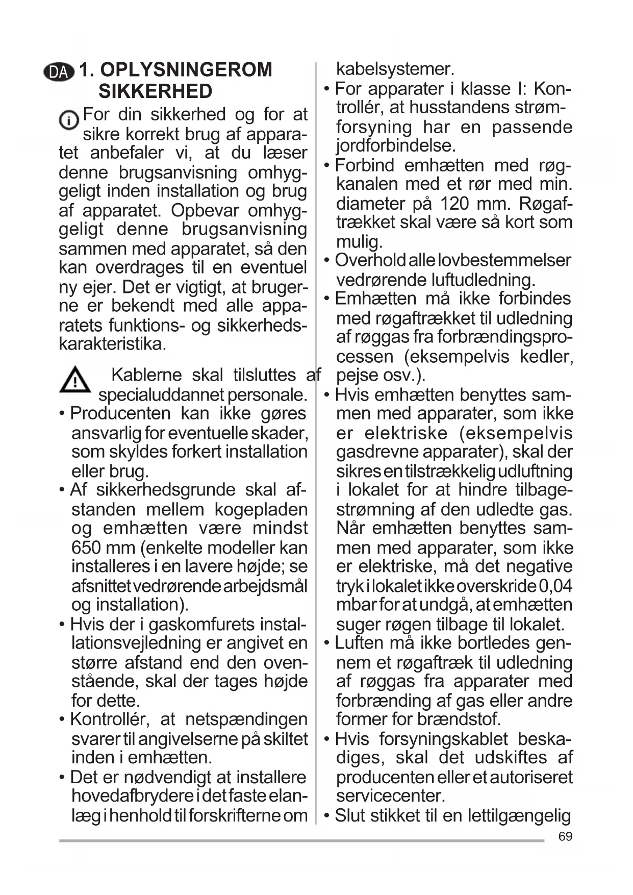 SIKKERHED For din sikkerhed og for at sikre korrekt brug af appara- tet anbefaler vi, at du læser denne brugsanvisning omhyg- geligt inden installation og brug af apparatet. Opbevar omhyg- geligt denne brugsanvisning sammen med apparatet, så den kan overdrages til en eventuel ny ejer. Det er vigtigt, at bruger- ne er bekendt med alle appa- ratets funktions- og sikkerheds- karakteristika. Kablerne skal tilsluttes af specialuddannet personale.