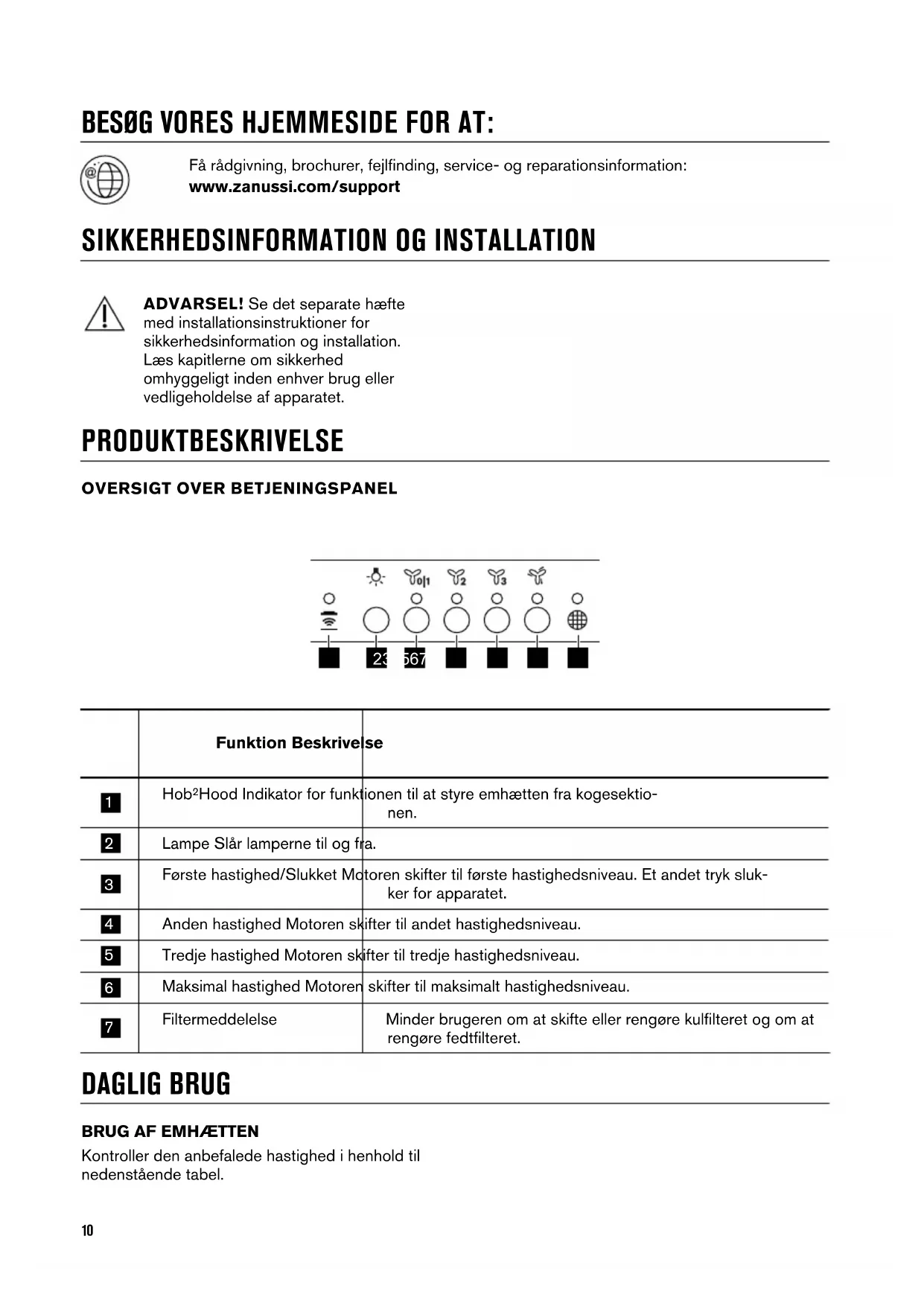 Kontroller den anbefalede hastighed i henhold til nedenstående tabel. 10Opvarmning af mad og tilberedning med gryder med låg på. Tilberedning af mad i gryder med låg på på flere kogezoner eller blus, let stegning. Kogning, stegning af store mængder mad uden låg på, madtilberedning på flere kogezoner eller blus. Kogning, stegning af store mængder mad uden låg på, me- get fugt. Emhætten kører på maksimal hastighed. Efter 6 minutter skifter apparatet tilbage til den forrige indstilling. Vi anbefaler, at man lader emhætten køre videre i ca. 15 minutter efter madlavningen. For at betjene emhætten: