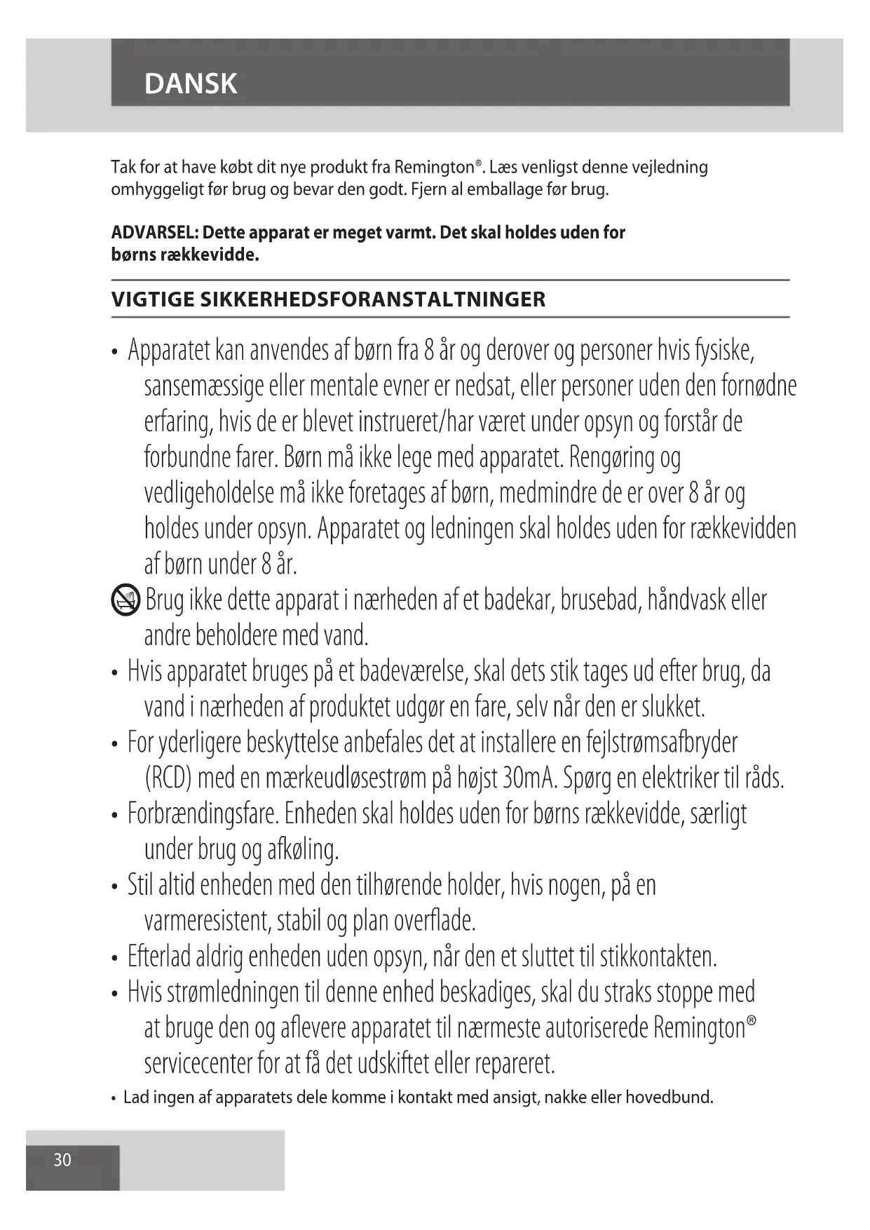 AE30 Tak for at have købt dit nye produkt fra Remington®. Læs venligst denne vejledning omhyggeligt før brug og bevar den godt. Fjern al emballage før brug. ADVARSEL: Dette apparat er meget varmt. Det skal holdes uden for børns rækkevidde. VIGTIGE SIKKERHEDSFORANSTALTNINGER