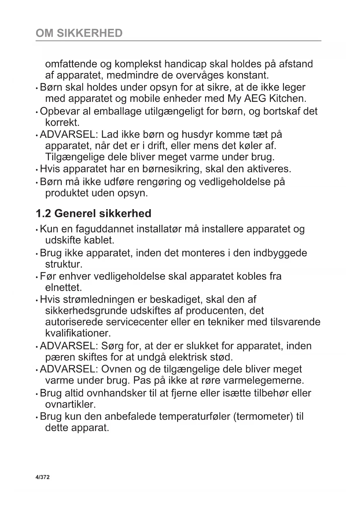 - Apparatet må kun bruges af børn fra 8 år og opefter samt af personer med nedsat fysisk, sensorisk eller psykisk funktionsevne, eller som mangler den nødvendige erfaring eller viden, hvis de er under opsyn eller er blevet instrueret i at bruge apparatet på en sikker måde samt forstår de farer, det indebærer. Børn under 8 år og personer med 3/372 OM SIKKERHEDomfattende og komplekst handicap skal holdes på afstand af apparatet, medmindre de overvåges konstant.