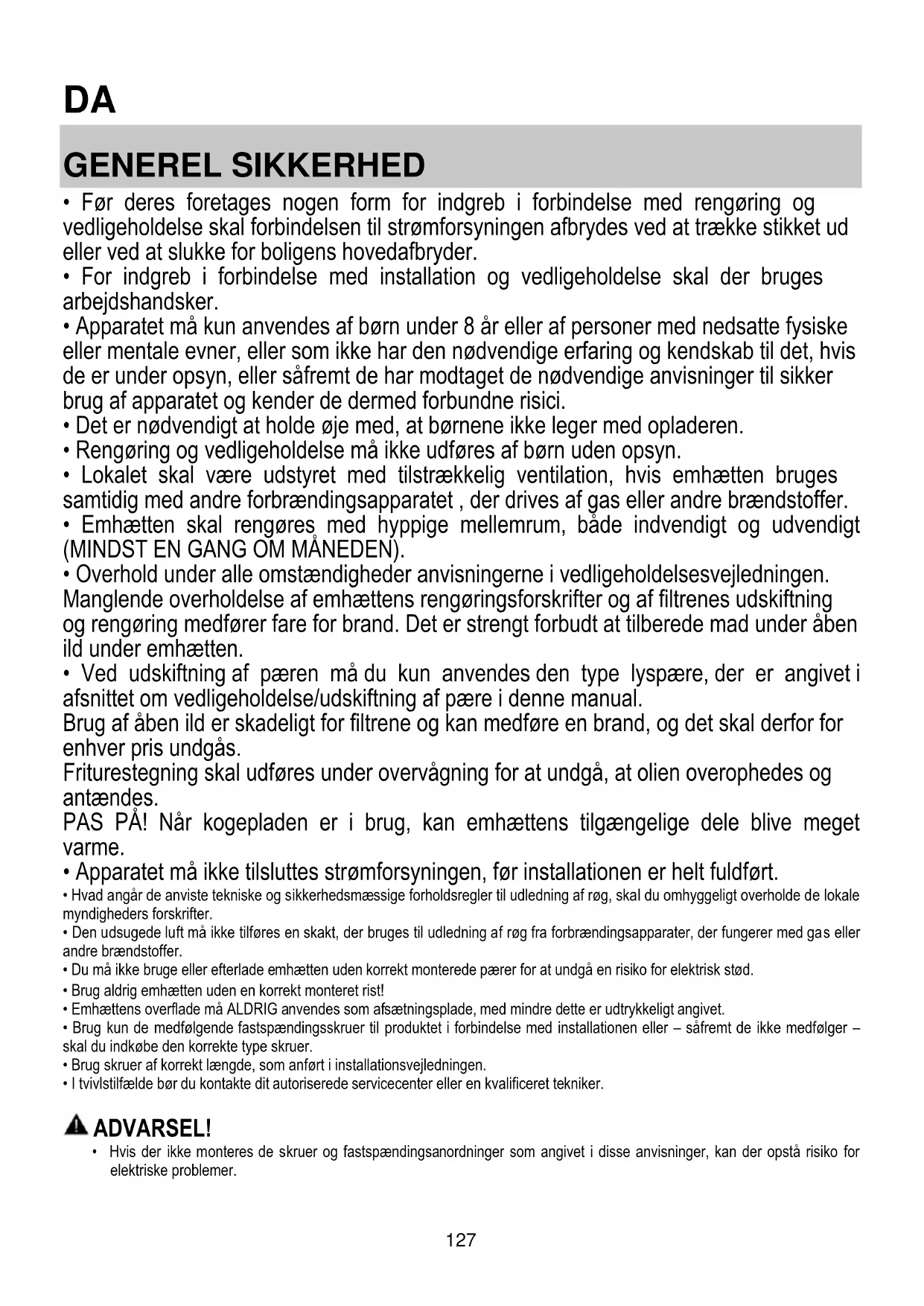 - Overhold under alle omstændigheder anvisningerne i vedligeholdelsesvejledningen. Manglende overholdelse af emhættens rengøringsforskrifter og af filtrenes udskiftning og rengøring medfører fare for brand. Det er strengt forbudt at tilberede mad under åben ild under emhætten.