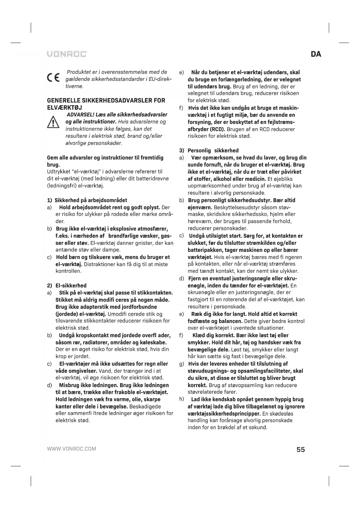 Før rengøring og vedligeholdelse skal du altid slukke for maskinen og fjerne batteripakken fra maskinen. Rengør maskinbeklædningerne regelmæssigt med en blød klud, helst efter hver anvendelse. Sørg for, at der ikke er støv eller snavs i ventilationsåbnin- gerne. Fjern snavs, der sidder meget godt fast, med en blød klud, der er fugtet i sæbevand. Brug ikke opløsningsmidler, som f.eks. benzin, sprit, ammoniak osv. Kemikalier som disse beskadiger de syntetiske komponenter. MILJØ Defekte og/eller bortskaffede elektriske og elektroniske apparater skal afl everes på en passende genbrugsstation. Kun for lande i EU Maskinværktøj må ikke bortskaffes sammen med husholdningsaffald. Ifølge EC-direktiv 2012/19/EU om affald af elektrisk og elektronisk udstyr og dets gennemførelse i den nationale lovgivning skal ma- skinværktøjer, der ikke længere anvendes, afl everes separat og bortskaffes på en miljøvenlig måde. GARANTI VONROC-produkter er udviklet til de højeste kva- litetsstandarder og er garanteret fri for defekter i både materialer og udførelse i den periode, der er retsligt angivet fra datoen for det originale køb. Hvis produktet skulle udvikle fejl i denne periode på grund af defekt materiale og/eller udførelse, bedes du kontakte VONROC direkte. Følgende omstændigheder er udelukket fra denne garanti: