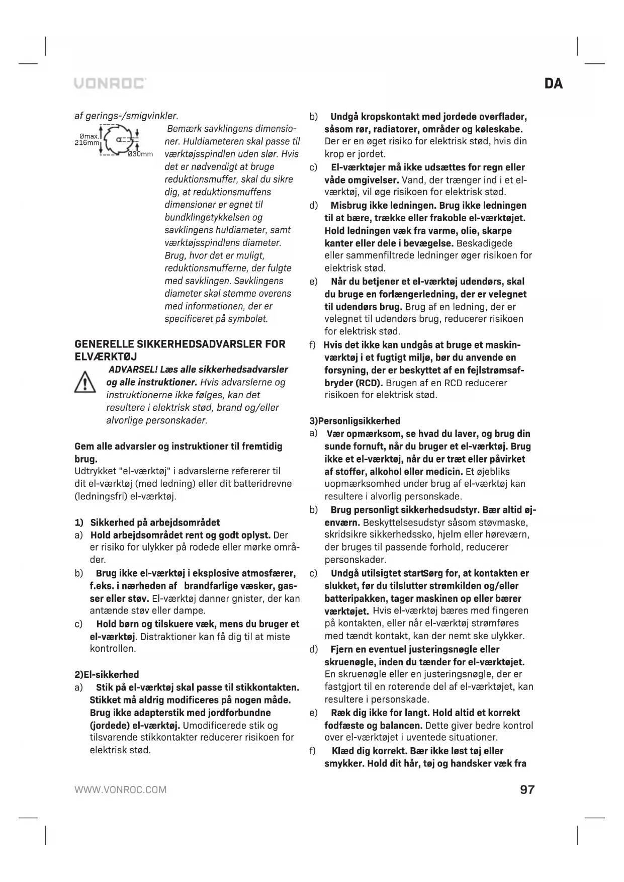 - Der er anvendt ikke-originale reservedele. Dette udgør den eneste garanti, virksomheden har givet, enten udtrykt eller underforstået. Der er ingen andre garantier, udtrykt eller underforstået, som strækker sig ud over denne, herunder de un- derforståede garantier for salgbarhed og egnethed til et bestemt formål. Under ingen omstændigheder skal VONROC holdes ansvarlig for tilfældige skader eller følgeskader. Forhandlerens retsmidler skal være begrænset til reparation eller udskiftning af enheder eller dele, der ikke overholder kravene. Produktet og brugervejledningen er genstand for ændringer. Specifikationer kan ændres uden yderligere varsel.PL