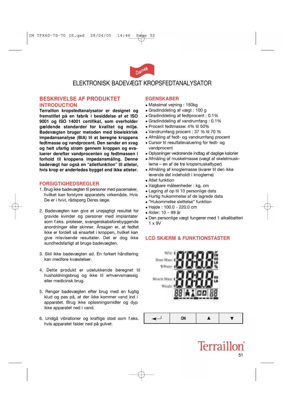 INTRODUCTION Terraillon kropsfedtanalysator er designet og fremstillet på en fabrik i besiddelse af et ISO 9001 og ISO 14001 certifikat, som overholder gældende standarder for kvalitet og miljø. Badevægten bruger metoden med bioelektrisk impedansanalyse (BIA) til at beregne kroppens fedtmasse og vandprocent. Den sender en svag og helt ufarlig strøm gennem kroppen og eva- luerer derefter vandprocenten og fedtmassen i forhold til kroppens impedansmåling. Denne badevægt har også en “atletfunktion” til atleter, hvis krop er anderledes bygget end ikke atleter. FORSIGTIGHEDSREGLER