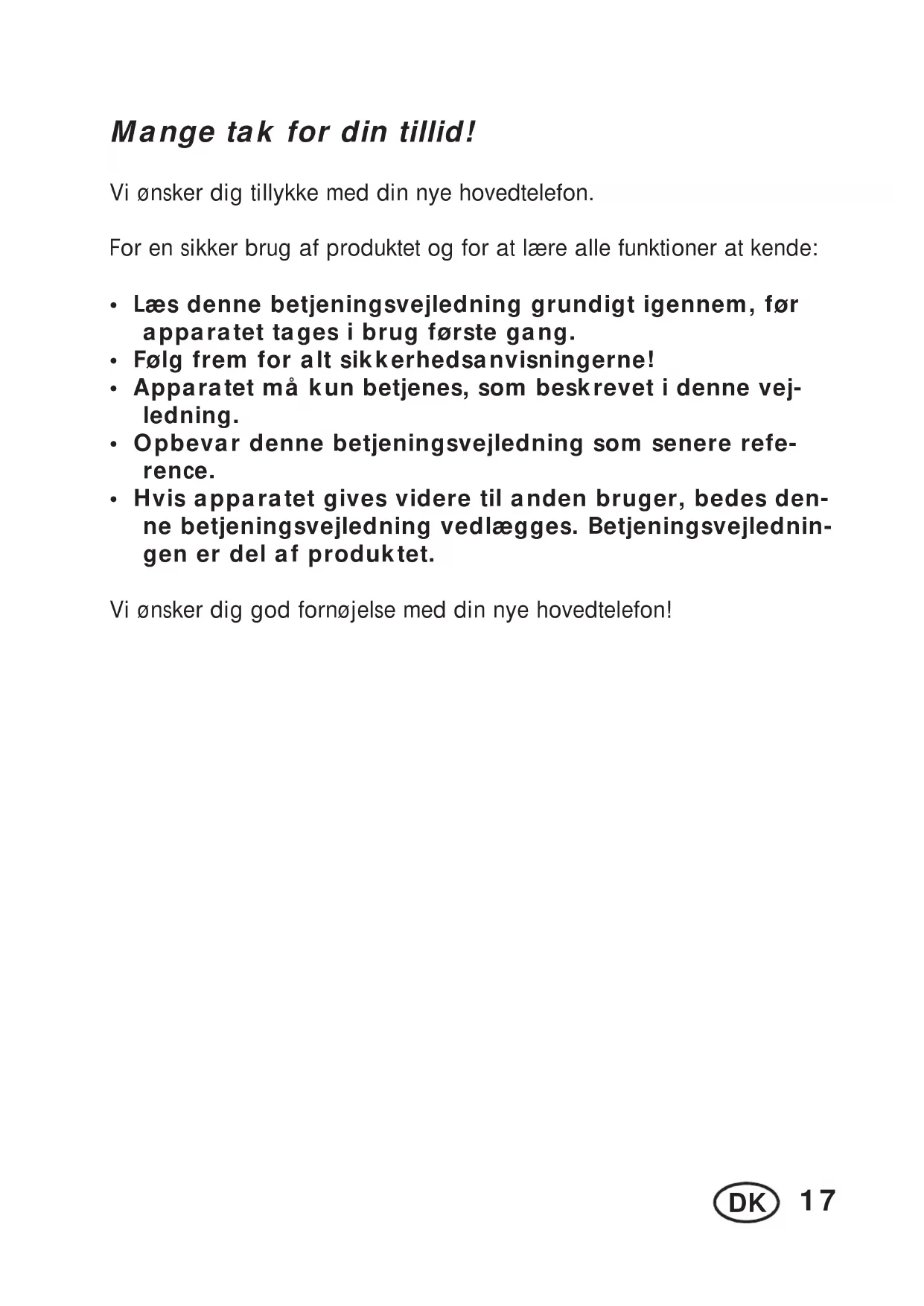 - Hvis apparatet gives videre til anden bruger, bedes den- ne betjeningsvejledning vedlægges. Betjeningsvejlednin- gen er del af produktet. Vi ønsker dig god fornøjelse med din nye hovedtelefon!18