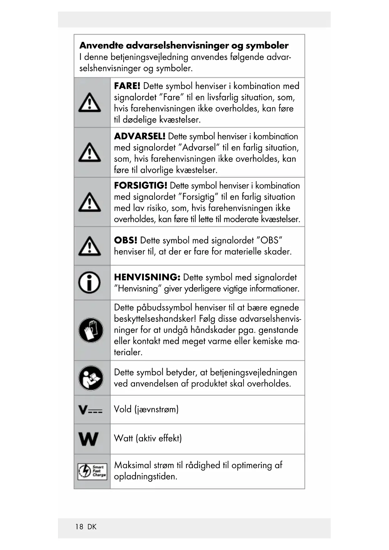- Ved samtidig benyttelse af alle udgange må det samlede strømoptag på 3A af de tilsluttede apparater ikke overskrides. Sikkerhedshenvisninger Gør dig inden ibrugtagning af produktet fortrolig med alle betjenings- og sikkerhedshenvisninger. Udlevér alle bilag ved videregivelse af produktet til tredjemand. Kontrollér produktet inden hver anvendelse for ydre, syn- lige skader. Tag ikke et beskadiget eller produkt, som er faldet ned, i brug. Dette produkt kan benyttes af børn fra 8-års alderen og opad, samt af personer med forringede fysiske, følelses- mæssige eller mentale evner eller mangel på erfaring og viden når de er under opsyn eller mht. sikker brug af pro- duktet er blevet vejledt og forstår de deraf resulterende farer. Børn må ikke lege med produktet. Rengøring og brugervedligeholdelse må ikke gennemføres af børn som ikke er under opsyn. FARE Emballagen er ikke legetøj. Fjern emballagen fra børn. Der består kvælningsfare! Benyt altid produktet på en stabil og jævn overflade. Ved styrt kan produktet beskadiges. Udsæt ikke produktet for direkte sollys eller høje tempe- raturer. I modsat fald kan produktet overophedes og be- skadiges, så det ikke kan repareres mere. Benyt produktet ikke i nærheden af varmekilder så som radiatorer eller andre varmegenererende apparater. Anvend ikke produktet i nærheden af åben ild. Produktet er ikke egnet til anvendelse i rum med høje temperaturer eller luftfugtighed (fx badeværelse) eller rum med meget støv. Sørg for at ingen fremmedlegemer kan trænge ind i produktets indre. Udsæt ikke produktet for ekstrem varme. Dette gælder især for opbevaring i bilen. Ved længere tids parkering22 DK opstår ekstreme temperaturer inde i bilen og i handske- rummet. Fjern elektriske og elektroniske apparater fra bilen. Anvend ikke produkt straks efter at det er bragt fra et køligt rum til et varmt rum. Lad produktet akklimatisere sig, inden det tages i brug. ADVARSEL Åbn aldrig produktets kabinet. Der be- finder sig ingen komponenter inden i produktet, som skal vedligeholdes. Foretag ikke nogen egenrådige ændringer ved produktet. Lad reparationer ved produktet kun foretages af autori- serede specialister eller kundeservice. Ved ukyndige reparationer kan der opstå alvorlige farer for brugeren. Tilmed ophører garantikravet. Udsæt ikke produktet for stænk og / eller dryp og placér ikke beholdere med vand som fx vaser eller åbne drikke- varer på eller ved siden af produktet. Sluk straks for produktet og fjern det eventuelt tilsluttede ladekabel fra produktet, hvis du opdager en brændt lugt eller røg. Lad en kvalificeret fagperson tjekke produktet, før du atter tager det i brug. Ved anvendelse af en USB-strømforsyning, skal den an- vendte stikdåse altid være nemt tilgængeligt, så at USB-strømforsyningen kan fjernes hurtigt fra dåsen ved en opstået fare. Vær i den forbindelse opmærksom på producentens betjeningsvejledning. ADVARSEL En forkert håndtering af lithium polymer batterier kan føre til brand, eksplosioner, udsivning af far- lige stoffer eller andre farlige situationer! Kast produktet ikke i ilden, da det integrerede batteri kan eksplodere. Vær opmærksom på brugerbegrænsninger, hhv. anven- delsesforbud for batteridrevne produkter i områder med særlig risiko, som fx tankstationer, flyvemaskiner, syge- huse etc. ADVARSEL Tildæk produktet ikke under opladningen. Ellers kan produktet overophedes.23 DK Ibrugtagning og betjening Opladning af powerbank Anvend pga. det høje strømoptag af powerbanken aldrig en Notebook- eller PC-USB-tilslutning til opladning af powerbanken. Anvend til opladning af powerbanken kun en egnet USB-strømforsyning (5 V , min. 3 A; ikke leveret). Inden ibrugtagningen af produktet skal det integrerede batteri oplades helt. Anvend til opladning af powerbanken