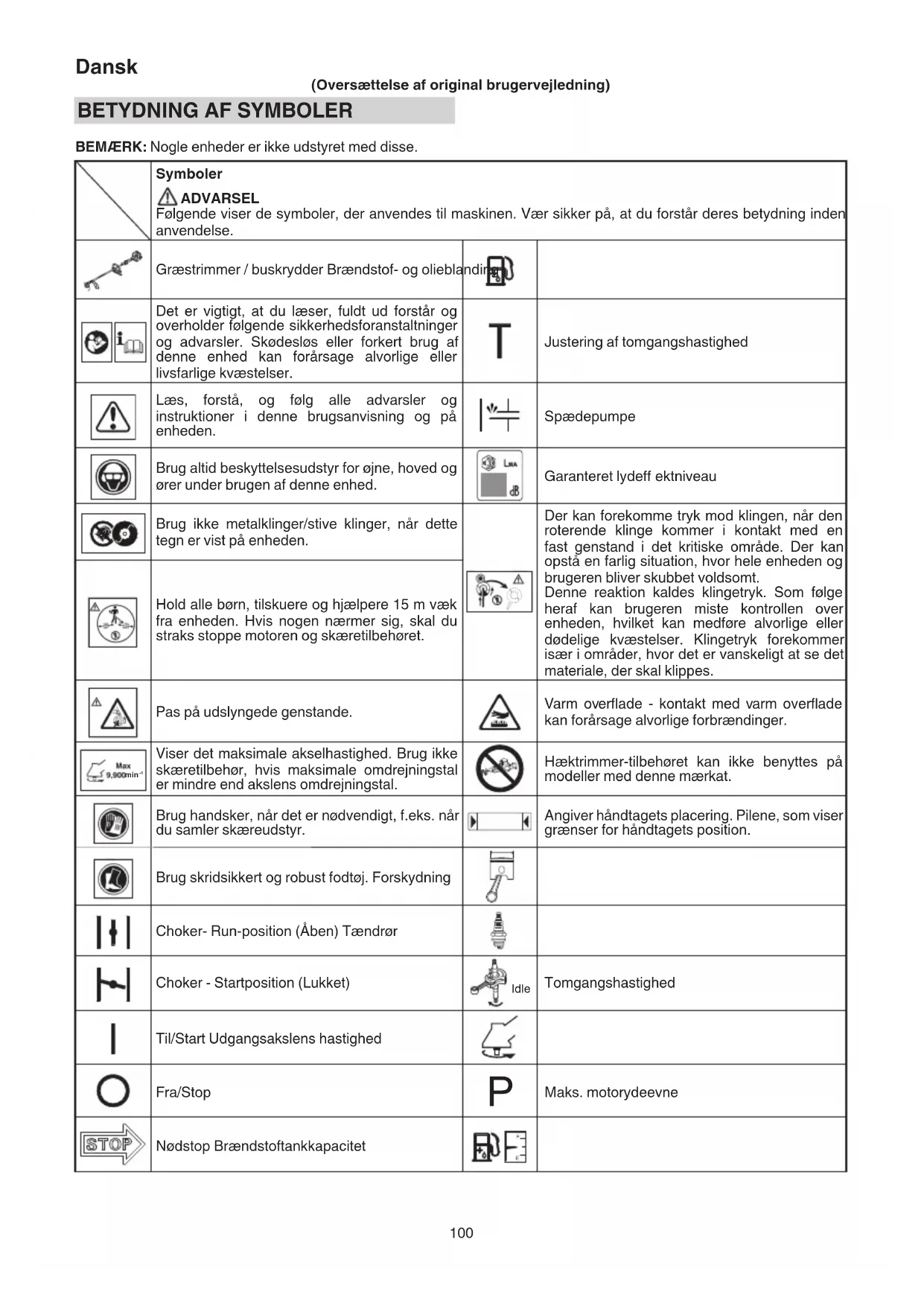 BEMÆRK: Nogle enheder er ikke udstyret med disse. Symboler ADVARSEL Følgende viser de symboler, der anvendes til maskinen. Vær sikker på, at du forstår deres betydning inden anvendelse. Græstrimmer / buskrydder Brændstof- og olieblanding Det er vigtigt, at du læser, fuldt ud forstår og overholder følgende sikkerhedsforanstaltninger og advarsler. Skødesløs eller forkert brug af denne enhed kan forårsage alvorlige eller livsfarlige kvæstelser. Justering af tomgangshastighed Læs, forstå, og følg alle advarsler og instruktioner i denne brugsanvisning og på enheden. Spædepumpe Brug altid beskyttelsesudstyr for øjne, hoved og ører under brugen af denne enhed. Garanteret lydeff ektniveau Brug ikke metalklinger/stive klinger, når dette tegn er vist på enheden. Der kan forekomme tryk mod klingen, når den roterende klinge kommer i kontakt med en fast genstand i det kritiske område. Der kan opstå en farlig situation, hvor hele enheden og brugeren bliver skubbet voldsomt. Denne reaktion kaldes klingetryk. Som følge heraf kan brugeren miste kontrollen over enheden, hvilket kan medføre alvorlige eller dødelige kvæstelser. Klingetryk forekommer især i områder, hvor det er vanskeligt at se det materiale, der skal klippes. Hold alle børn, tilskuere og hjælpere 15 m væk fra enheden. Hvis nogen nærmer sig, skal du straks stoppe motoren og skæretilbehøret. Pas på udslyngede genstande. Varm overfl ade - kontakt med varm overfl ade kan forårsage alvorlige forbrændinger. min