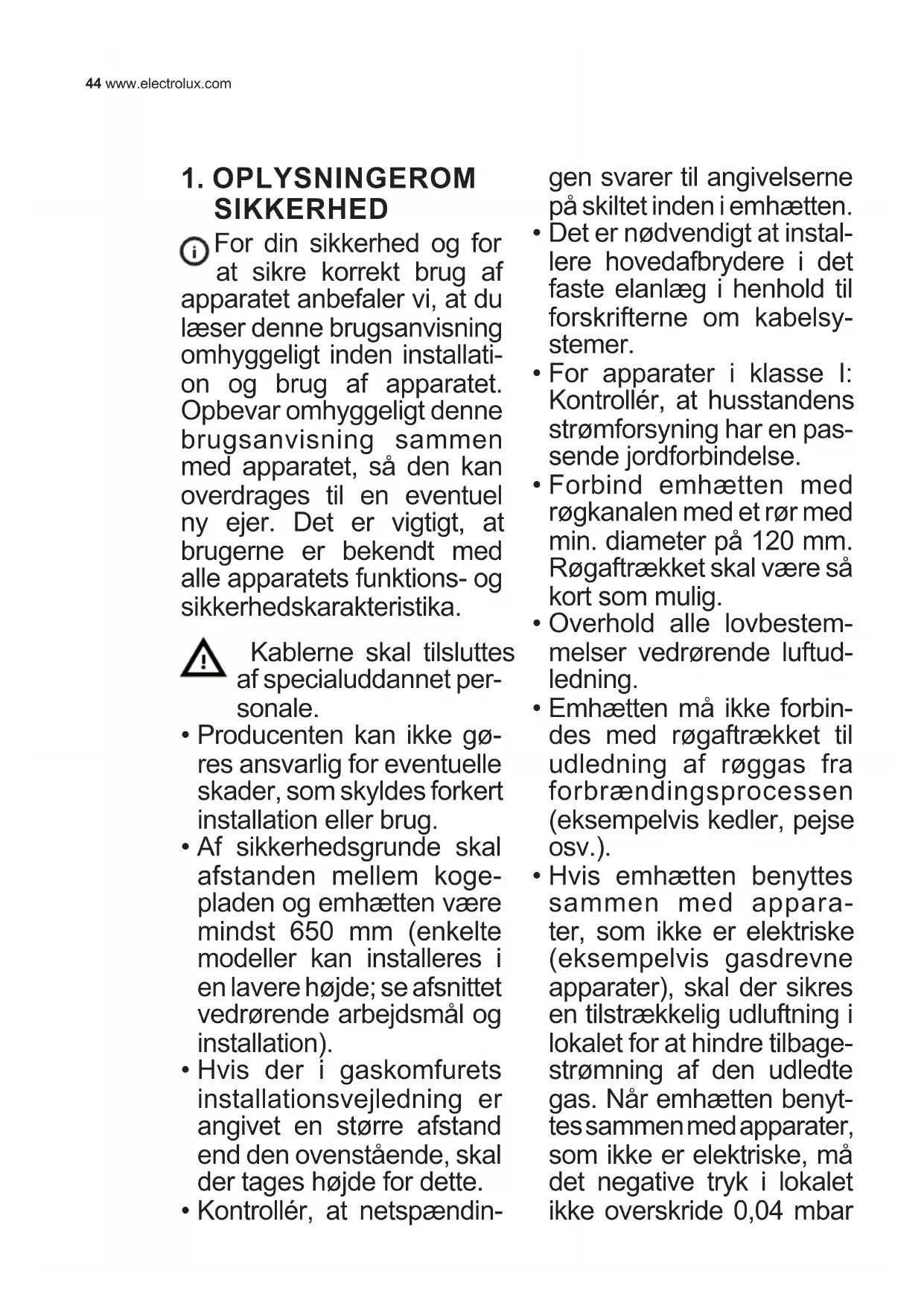 - Hvis emhætten benyttes sammen med appara- ter, som ikke er elektriske (eksempelvis gasdrevne apparater), skal der sikres en tilstrækkelig udluftning i lokalet for at hindre tilbage- strømning af den udledte gas. Når emhætten benyt- tes sammen med apparater, som ikke er elektriske, må det negative tryk i lokalet ikke overskride 0,04 mbar BRUGSVEJLEDNING45DANISH for at undgå, at emhætten suger røgen tilbage til lo- kalet.