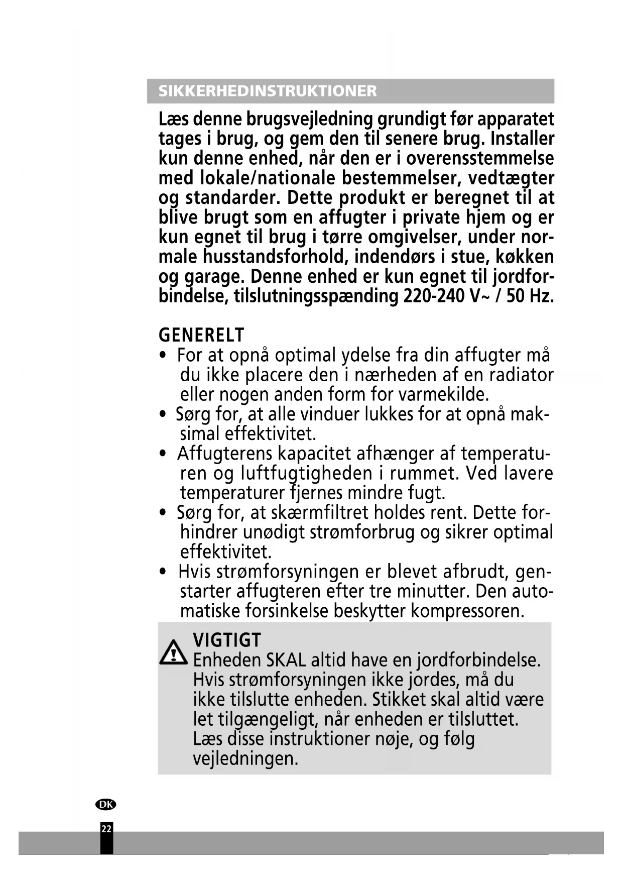 - Hvis strømforsyningen er blevet afbrudt, gen- starter affugteren efter tre minutter. Den auto- matiske forsinkelse beskytter kompressoren. VIGTIGT Enheden SKAL altid have en jordforbindelse. Hvis strømforsyningen ikke jordes, må du ikke tilslutte enheden. Stikket skal altid være let tilgængeligt, når enheden er tilsluttet. Læs disse instruktioner nøje, og følg vejledningen.
