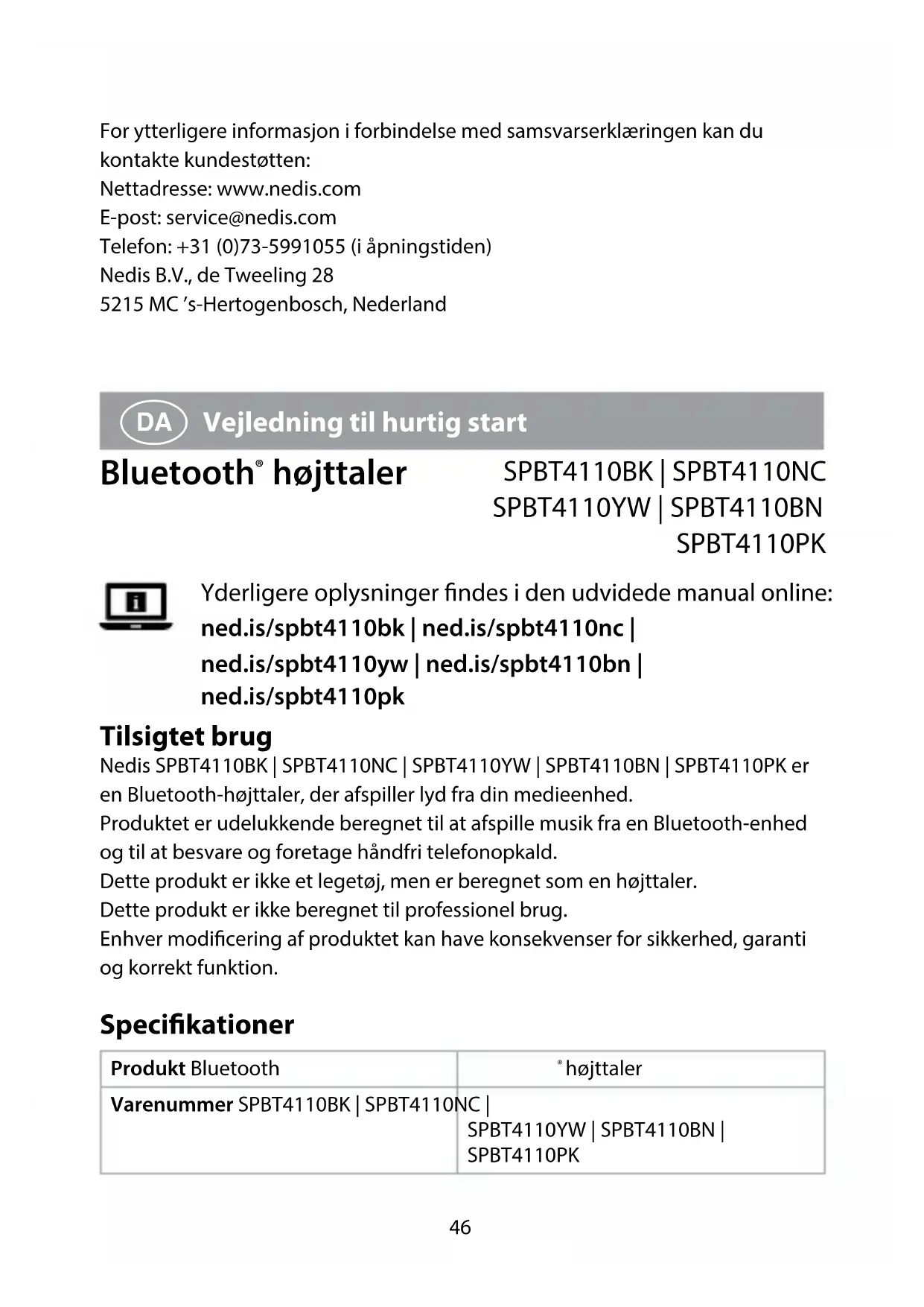 SPBT4110PK Yderligere oplysninger ndes i den udvidede manual online: ned.is/spbt4110bk | ned.is/spbt4110nc | ned.is/spbt4110yw | ned.is/spbt4110bn | ned.is/spbt4110pk Tilsigtet brug Nedis SPBT4110BK | SPBT4110NC | SPBT4110YW | SPBT4110BN | SPBT4110PK er en Bluetooth-højttaler, der afspiller lyd fra din medieenhed. Produktet er udelukkende beregnet til at afspille musik fra en Bluetooth-enhed og til at besvare og foretage håndfri telefonopkald. Dette produkt er ikke et legetøj, men er beregnet som en højttaler. Dette produkt er ikke beregnet til professionel brug. Enhver modicering af produktet kan have konsekvenser for sikkerhed, garanti og korrekt funktion. Specikationer Produkt Bluetooth