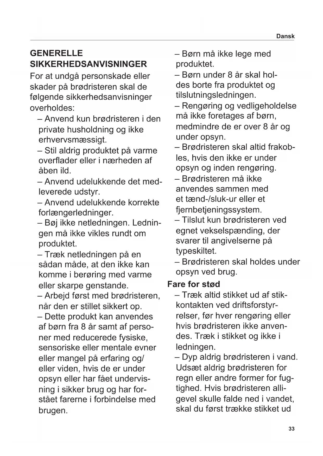 KRUMMEBAKKEN Tøm helst krummebakken (8) efter hver anvendelse, så brød- krummer ikke forkuller i brødri- steren eller brænder sammen (se kapitlet RENGØRING). RENGØRING Rengør brødristeren efter hver anvendelse, da fordærvelige rester kan sætte sig fast. ADVARSEL, fare for stød: Træk først stikket ud af stik- kontakten inden rengøringen. FORSIGTIG, fare for forbrænding: Lad brødristeren afkøle inden rengøring.