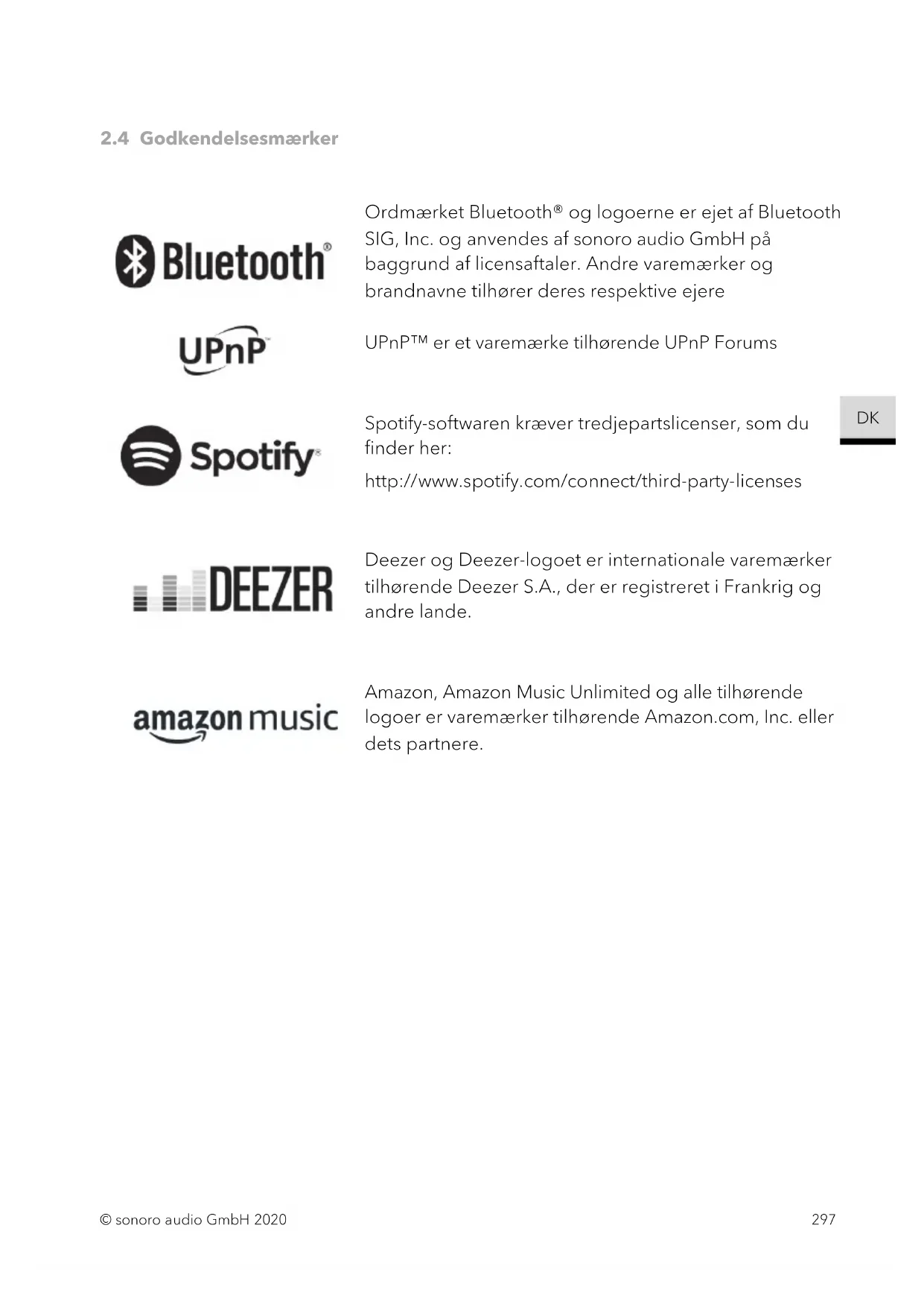 Ordmærket Bluetooth® og logoerne er ejet af Bluetooth SIG, Inc. og anvendes af sonoro audio GmbH på baggrund af licensaftaler. Andre varemærker og brandnavne tilhører deres respektive ejere UPnP™ er et varemærke tilhørende UPnP Forums