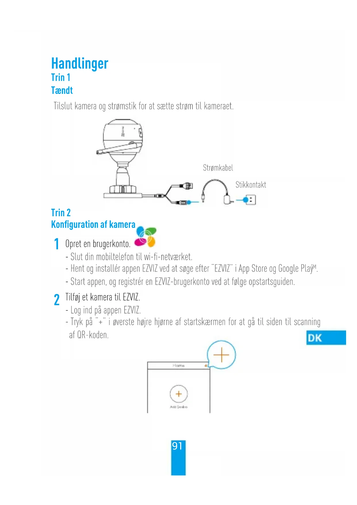 Tilføj et kamera til EZVIZ. - Log ind på appen EZVIZ. - Tryk på “+” i øverste højre hjørne af startskærmen for at gå til siden til scanning af QR-koden.92 - Scan QR-koden på kamerahuset. - Følg guiden til appen EZVIZ for at afslutte konfigurationen af wi-fi.