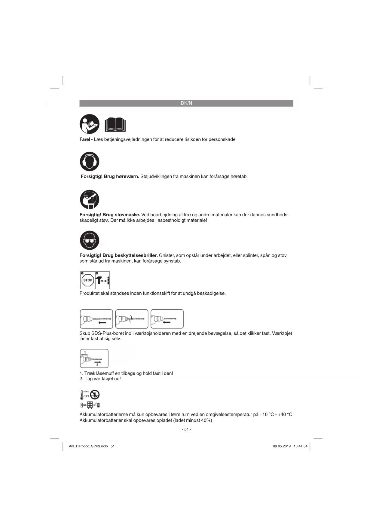 Fare! - Læs betjeningsvejledningen for at reducere risikoen for personskade Forsigtig! Brug høreværn. Støjudviklingen fra maskinen kan forårsage høretab. Forsigtig! Brug beskyttelsesbriller. Gnister, som opstår under arbejdet, eller splinter, spån og støv, som står ud fra maskinen, kan forårsage synstab. Forsigtig! Brug støvmaske. Ved bearbejdning af træ og andre materialer kan der dannes sundheds- skadeligt støv. Der må ikke arbejdes i asbestholdigt materiale! Akkumulatorbatterierne må kun opbevares i tørre rum ved en omgivelsestemperatur på +10 °C - +40 °C. Akkumulatorbatterier skal opbevares opladet (ladet mindst 40%) Produktet skal standses inden funktionsskift for at undgå beskadigelse. Skub SDS-Plus-boret ind i værktøjsholderen med en drejende bevægelse, så det klikker fast. Værktøjet låser fast af sig selv.