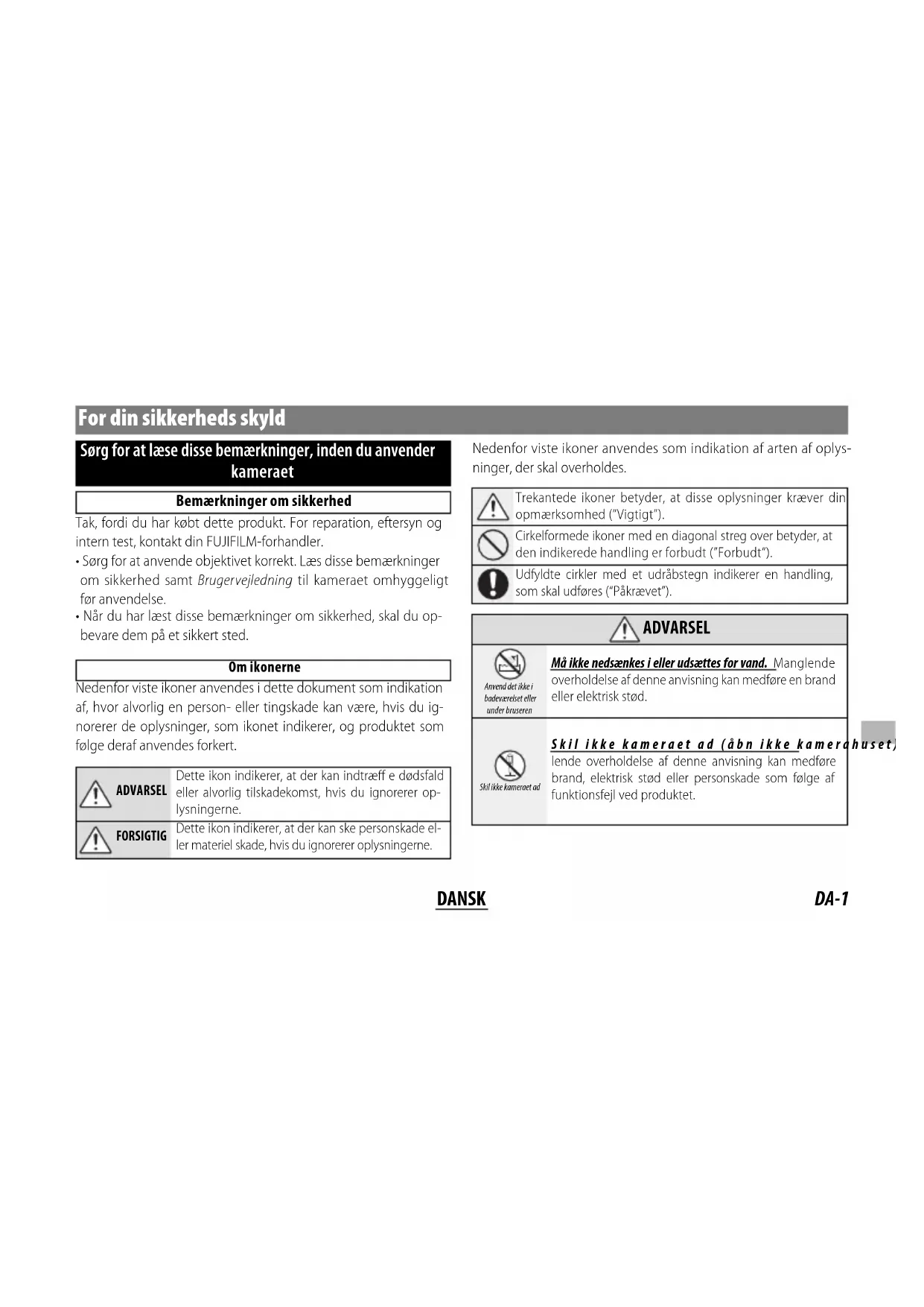 - Når du har læst disse bemærkninger om sikkerhed, skal du op- bevare dem på et sikkert sted. Om ikonerne Nedenfor viste ikoner anvendes i dette dokument som indikation af, hvor alvorlig en person- eller tingskade kan være, hvis du ig- norerer de oplysninger, som ikonet indikerer, og produktet som følge deraf anvendes forkert. ADVARSELDette ikon indikerer, at der kan indtræff e dødsfald eller alvorlig tilskadekomst, hvis du ignorerer op-lysningerne.FORSIGTIGDette ikon indikerer, at der kan ske personskade el-ler materiel skade, hvis du ignorerer oplysningerne. Nedenfor viste ikoner anvendes som indikation af arten af oplys- ninger, der skal overholdes. Trekantede ikoner betyder, at disse oplysninger kræver din opmærksomhed (”Vigtigt”).Cirkelformede ikoner med en diagonal streg over betyder, at den indikerede handling er forbudt (”Forbudt”).Udfyldte cirkler med et udråbstegn indikerer en handling, som skal udføres (“Påkrævet”). ADVARSEL ADVARSEL Anvend det ikke i badeværelset eller under bruserenMå ikke nedsænkes i eller udsættes for vand. Manglende overholdelse af denne anvisning kan medføre en brand eller elektrisk stød.Skil ikke kameraet adSkil ikke kameraet ad (åbn ikke kamerahuset). Mang-lende overholdelse af denne anvisning kan medføre brand, elektrisk stød eller personskade som følge af funktionsfejl ved produktet.DA-2 DANSK ADVARSEL ADVARSEL Rør ikke ved de indvendige dele Hvis kameraet går i stykker som følge af, at du taber det, eller der sker et andet uheld, må du ikke røre ved de dele, der kommer til syne. Manglende overholdelse af denne anvisning kan medføre elektrisk stød eller personskade ved berøring af de beskadigede dele. Tag øjeblikkeligt kameraets batteri ud - pas på, at du ikke kommer til skade eller får elektrisk stød - og indlevér produktet til eftersyn på købsstedet. Må ikke anbringes på ustabile over ader. Produktet kan falde ned og medføre tilskadekomst. Se ikke på solen gennem objektivets eller kameraets søger. Manglende overholdelse af denne anvisning kan med- føre permanent skade på synet. FORSIGTIG FORSIGTIG Må ikke anvendes eller opbevares på steder med damp el- ler røg, eller som er meget fugtige eller ekstremt støvede. Manglende overholdelse af denne anvisning kan med- føre brand eller elektrisk stød. Må ikke efterlades i direkte sollys eller på steder med me- get høje temperaturer, såsom i et lukket køretøj på en solrig dag. Manglende overholdelse af denne anvisning kan medføre brand. FORSIGTIG FORSIGTIG Opbevar kameraet utilgængeligt for små børn. Dette pro- dukt kan medføre personskade, når det er i hænderne på børn. Må ikke håndteres med våde hænder. Manglende over- holdelse af denne anvisning kan medføre elektrisk stød. Hold sollyset væk fra billedet, når du tager billeder af mo- tiver i modlys. Hvis sollyset fokuseres i kameraet, når solen er i eller tæt på billedet kan medføre brand eller forbrændinger. Når produktet ikke anvendes, skal du sætte objektivdæks- le rne på igen og opbevare det på et sted ud en direkte sol lys. Sollys fokuseret af objektivet kan medføre brand eller forbrændinger. Bær ikke kameraet eller objektivet, mens de er monteret på et stativ. Produktet kan falde ned eller ramme andre genstande og medføre tilskadekomst.DA-3 DANSK Bortska else af elektrisk og elektronisk udstyr i private husholdninger Bortska else af elektrisk og elektronisk udstyr i private husholdninger I EU, Norge, Island og Liechtenstein: Dette symbol på produktet eller i brugervejledningen og i garantien og/eller på emballagen bety- der, at dette produkt ikke bør behandles som husholdningsaff ald. Det bør i stedet afl everes på et egnet indsamlingssted for genbrug af elektrisk og elektronisk udstyr. Når du sikrer en korrekt bortskaff else af dette produkt, bidrager du til at fore- bygge potentielle negative konsekvenser for miljø og folkesundhed, som ellers vil kunne opstå ved uhensigtsmæssig aff aldshåndtering af dette produkt. Genbrug af materialet bidrager til at bevare naturens ressourcer. For mere detaljerede oplysninger om genbrug af dette produkt, bedes du kontakte de lokale myndigheder, dit lokale renovationsfi rma eller den forretning, hvor du har købt produktet. I lande uden for EU, Norge, Island og Liechtenstein: Hvis du ønsker at kassere dette produkt, herunder batterier eller akkumulatorer, bedes du kontakte de lokale myndigheder og få anvist den korrekte bortskaff elsesprocedure.DA-4 DANSK Før anvendelse af dette produkt Visse objektivfunktioner er ikke tilgængelige med ældre versioner af kameraets rmware. Sørg for at opdatere kameraets rmware til den nyeste version. Du kan nde instruktioner i visning af ka- meraets rmwareversion samt opdatering af ka- meraets rmware på følgende hjemmeside: http://www.fujifilm.com/support/digital_cameras/ software/#firmware Hvis du ikke har adgang til en computer, kan du få support hos den lokale forhandler op- stillet i materialet ”FUJIFILM verdensomspæn- dende netværk”, der følger med dit kamera. Produktvedligeholdelse