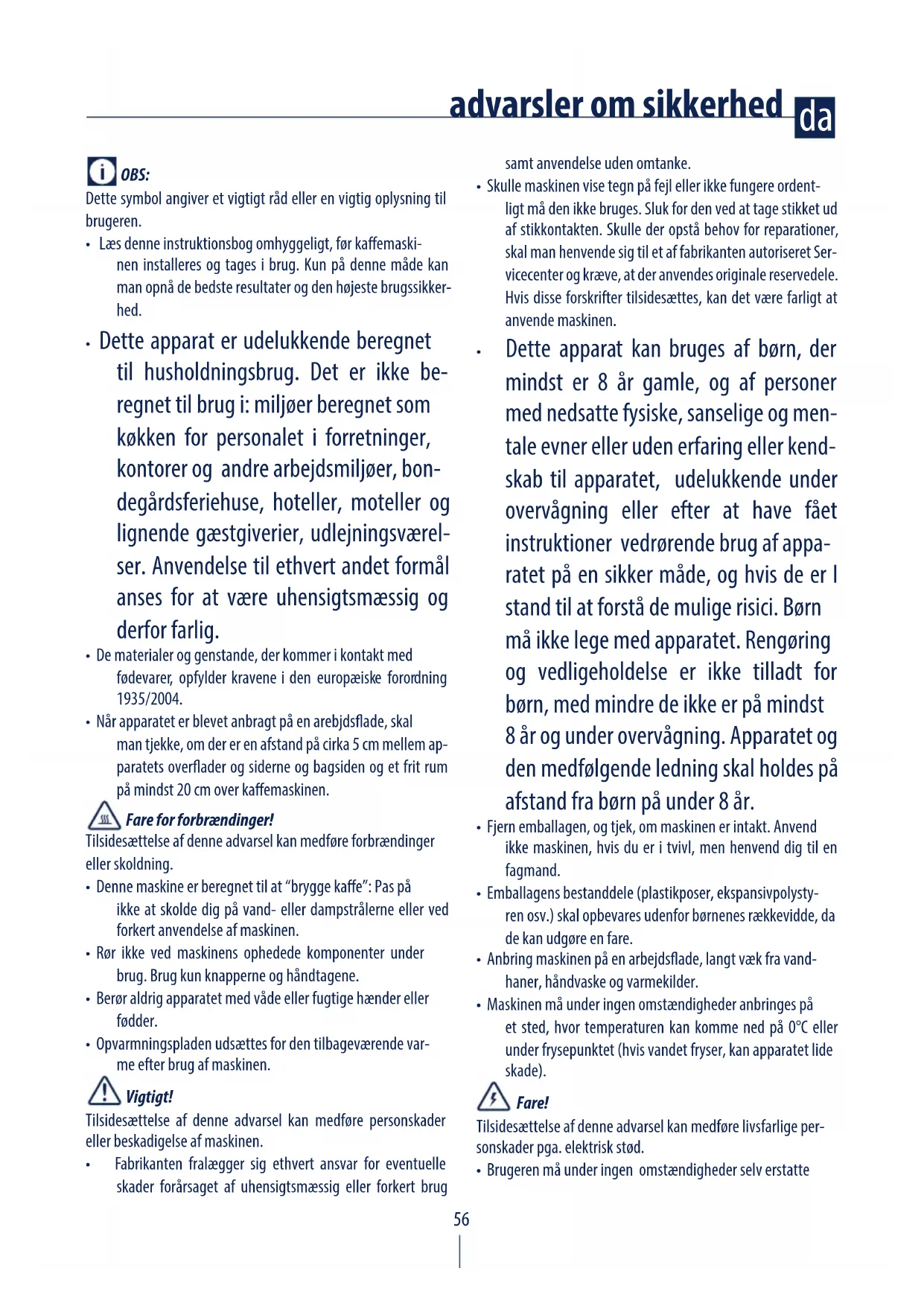 - Denne maskine er beregnet til at “brygge kae”: Pas på ikke at skolde dig på vand- eller dampstrålerne eller ved forkert anvendelse af maskinen.
