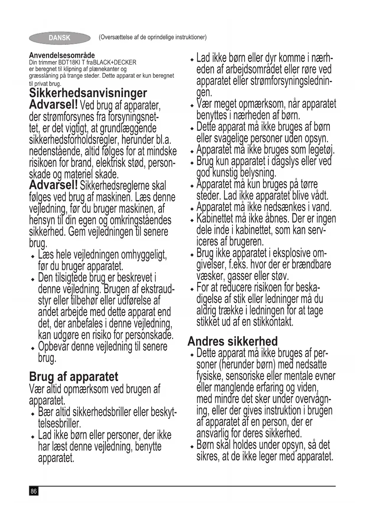 T18KI IT86 (Oversættelse af de oprindelige instruktioner) DANSK Anvendelsesområde Din trimmer BDT18KI T fra er beregnet til klipning af plænekanter og græsslåning på trange steder. Dette apparat er kun beregnet til privat brug. Sikkerhedsanvisninger Advarsel! Ved brug af apparater, der strømforsynes fra forsyningsnet- tet, er det vigtigt, at grundlæggende sikkerhedsforholdsregler, herunder bl.a. nedenstående, altid følges for at mindske risikoen for brand, elektrisk stød, person- skade og materiel skade. Advarsel! Sikkerhedsreglerne skal følges ved brug af maskinen. Læs denne vejledning, før du bruger maskinen, af hensyn til din egen og omkringståendes sikkerhed. Gem vejledningen til senere brug.