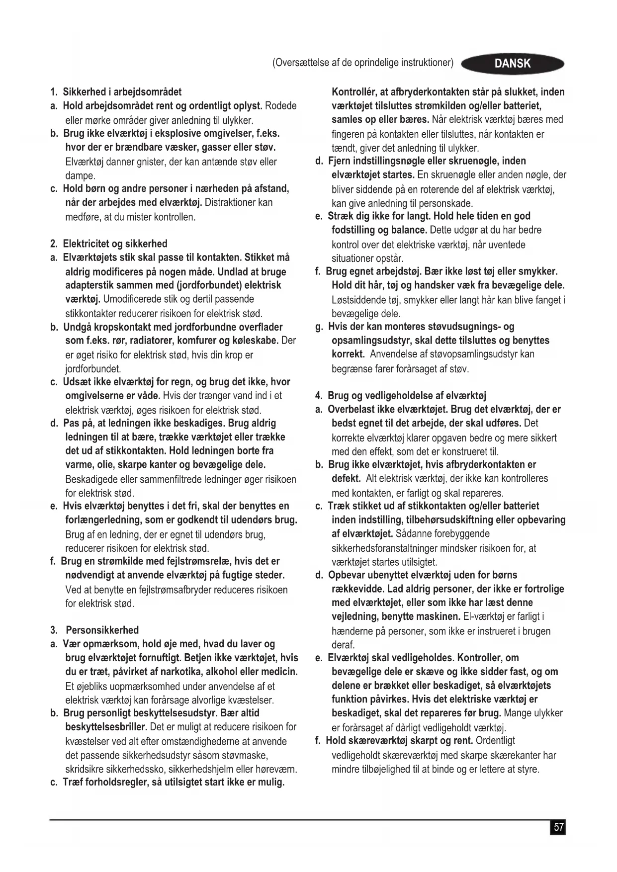 Advarsel! Læs alle sikkerhedsadvarsler og alle instruktioner. Hvis efterfølgende advarsler og instruktioner ikke følges, er der risiko for elektrisk stød, brand og alvorlige kvæstelser. Gem alle advarsler og instruktioner til fremtidig reference. Begrebet "elværktøj", der benyttes i nedenstående advarsler, henviser til netdrevet elværktøj (med netledning) eller bat- teridrevet elværktøj (uden netledning).57 (Oversættelse af de oprindelige instruktioner) DANSK