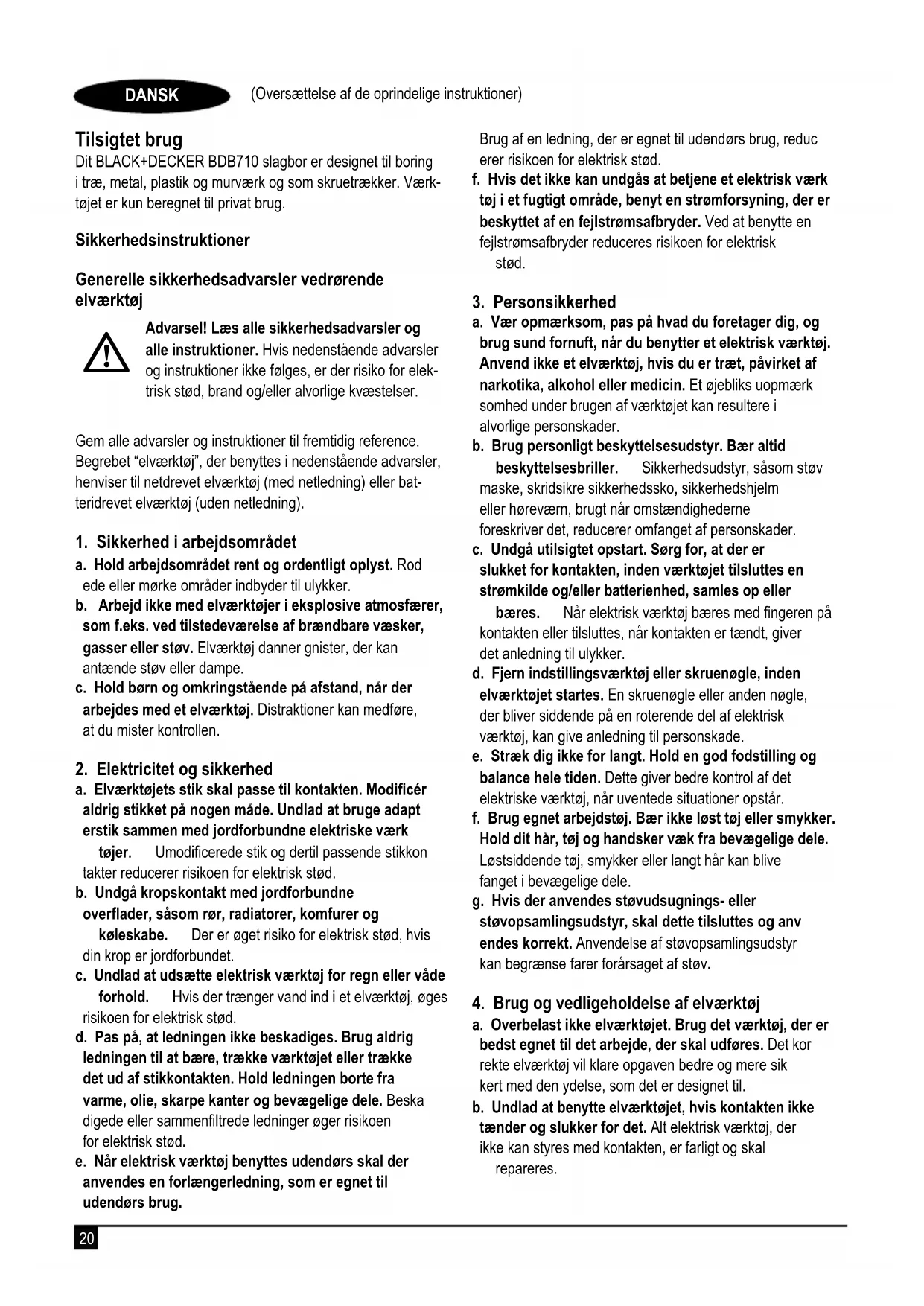 -positionen. Indstilling af boredybde (g. G) u Løsn sidehåndtaget (7) ved at dreje grebet mod uret. u Indstil dybdestoppet (6) til den ønskede position. Den maksimale boredybde er afstanden mellem borets spids og den forreste del af dybdestoppet. u Spænd sidehåndtaget ved at dreje grebet med uret. Start og stop u Tryk på kontakten til variabel hastighed for at starte værktøjet (1). Værktøjets hastighed afhænger af, hvor langt du trykker kontakten. Brug generelt lave hastigheder til bor med stor diameter og lave hastigheder til bor med mindre diameter. u Tryk på spærreknappen (2) og udløs kontakten til variabel hastighed for at opnå konstant funktion. Denne indstilling er kun mulig ved fuld hastighed ved både forlæns og baglæns omløb. u Udløs kontakten til variabel hastighed for at stoppe værktøjet. Sluk for værktøjet efter arbejde i konstant funktion ved at trykke på kontakten til variabel hastighed igen for at udløse den. Tilbehør Værktøjets ydeevne afhænger af det anvendte tilbehør. Tilbehør fra BLACK+DECKER er fremstillet efter høje kvalitetsstandarder og er designet til at forbedre dit værktøjs ydeevne. Når du bruger dette tilbehør, vil værktøjet yde optimalt. Vedligeholdelse Dit BLACK+DECKER-apparat/værktøj med eller uden ledn- ing er beregnet til brug gennem lang tid med et minimum af vedligeholdelse. Vedvarende tilfredsstillende funktion er afhængig af, om apparatet plejes korrekt og rengøres regelmæssigt. Advarsel! Inden udførelse af vedligeholdelsesarbejde på elværktøjer med/uden ledninger: u Sluk, og tag apparatets/værktøjets stik ud af stikkontakten. u Sluk og tag batteriet ud af apparatet/værktøjet, hvis ap- paratet/værktøjet har en separat batteripakke. u Eller aad batteriet helt, hvis det er indbygget, og og sluk derefter. u Træk opladeren ud af stikkontakten, før den rengøres. Din oplader kræver ingen vedligeholdelse udover jævnlig rengøring. u Rengør regelmæssigt ventilationsåbningerne i dit apparat/ værktøj/oplader med en blød børste eller en tør klud. u Rengør med jævne mellemrum motorhuset med en fugtig klud. Der må ikke bruges skuremidler eller opløsnings- midler. u Åbn jævnligt patronen, og bank på den for at fjerne støv indvendigt (hvis monteret). Udskiftning af netstik (kun Storbritannien og Irland) Hvis et nyt lysnetstik skal monteres: u Det gamle stik skal bortskaffes på en sikker måde. u Slut den brune ledning til den strømførende klemme på det nye stik. u Slut den blå ledning til den neutrale klemme. Advarsel! Der skal ikke tilsluttes til jordklemmen. Følg de monteringsinstruktioner, der følger med stik af god kvalitet. Anbefalet sikring: 5 A. Miljøbeskyttelse Særskilt bortskaffelse. Produkter og batterier mærket med dette symbol må ikke bortskaffes sammen med normalt husholdningsaffald. Produkter og batterier indeholder materialer, der kan genvin- des eller genbruges og således reducere efterspørgslen efter råvarer. Genbrug venligst elektriske produkter og batterier i henhold til lokale bestemmelser. Yderligere informationer ndes på www.2helpU.com Tekniske data BDB710 Indgangsspænding V