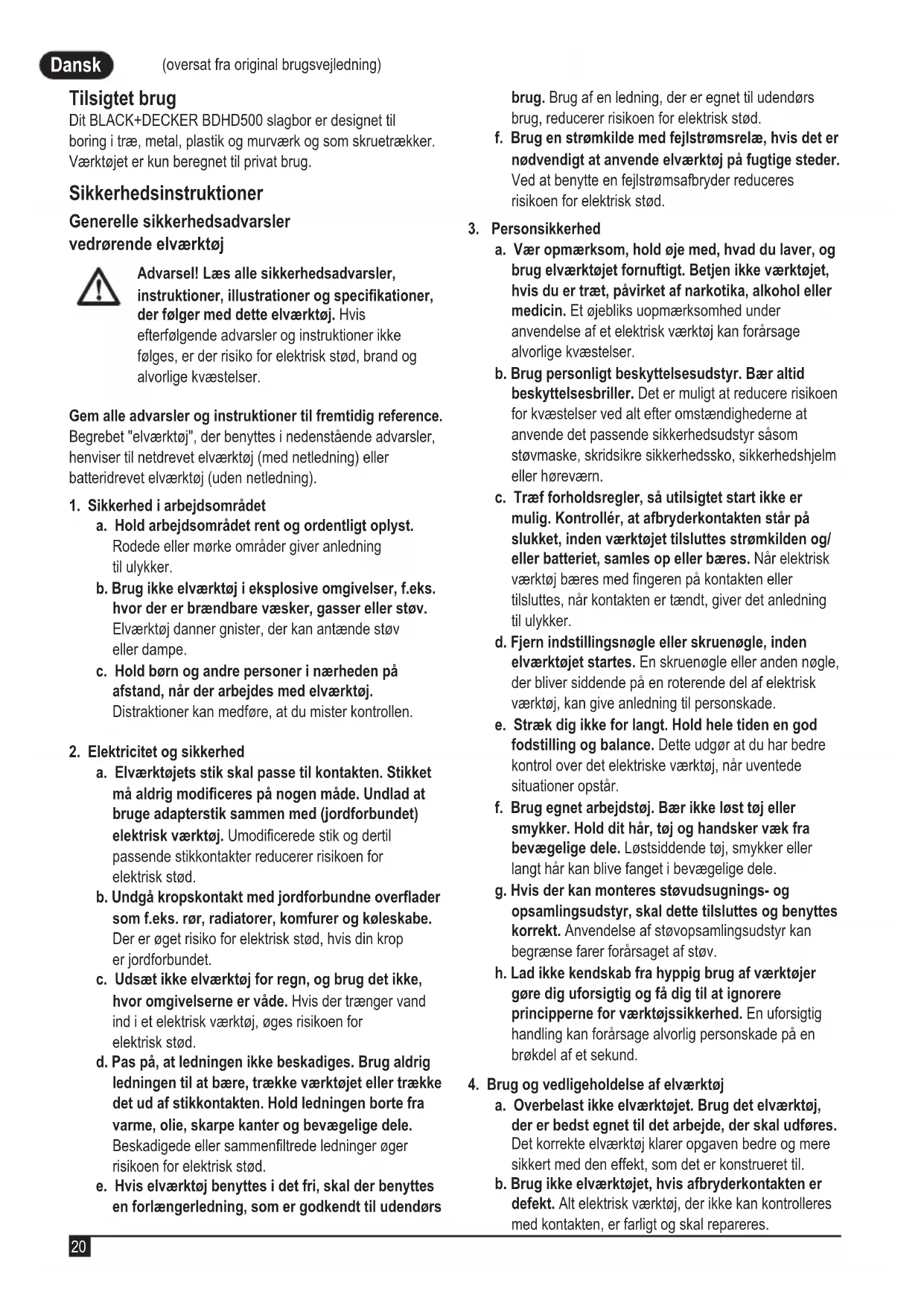 (oversat fra original brugsvejledning) Dansk (oversat fra original brugsvejledning) Tilsigtet brug Dit BLACK+DECKER BDHD500 slagbor er designet til boring i træ, metal, plastik og murværk og som skruetrækker. Værktøjet er kun beregnet til privat brug. Sikkerhedsinstruktioner Generelle sikkerhedsadvarsler vedrørende elværktøj Advarsel! Læs alle sikkerhedsadvarsler, instruktioner, illustrationer og specikationer, der følger med dette elværktøj. Hvis efterfølgende advarsler og instruktioner ikke følges, er der risiko for elektrisk stød, brand og alvorlige kvæstelser. Gem alle advarsler og instruktioner til fremtidig reference. Begrebet "elværktøj", der benyttes i nedenstående advarsler, henviser til netdrevet elværktøj (med netledning) eller batteridrevet elværktøj (uden netledning).