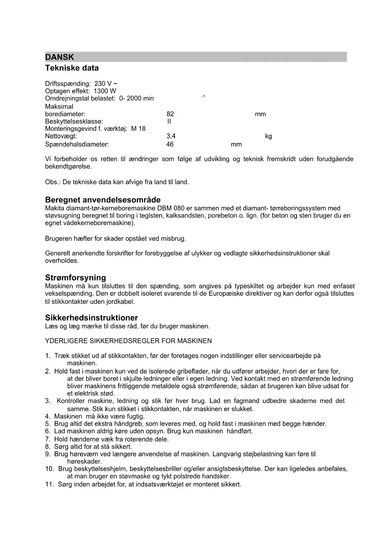 Maksimal borediameter: 82 mm Beskyttelsesklasse: II Monteringsgevind f. værktøj: M 18 Nettovægt: 3,4 kg Spændehalsdiameter: 46 mm Vi forbeholder os retten til ændringer som følge af udvikling og teknisk fremskridt uden forudgående bekendtgørelse. Obs.: De tekniske data kan afvige fra land til land. Beregnet anvendelsesområde Makita diamant-tør-kerneboremaskine DBM 080 er sammen med et diamant- tørreboringssystem med støvsugning beregnet til boring i teglsten, kalksandsten, porebeton o. lign. (for beton og sten bruger du en egnet vådekerneboremaskine). Brugeren hæfter for skader opstået ved misbrug. Generelt anerkendte forskrifter for forebyggelse af ulykker og vedlagte sikkerhedsinstruktioner skal overholdes. Strømforsyning Maskinen må kun tilsluttes til den spænding, som angives på typeskiltet og arbejder kun med enfaset vekselspænding. Den er dobbelt isoleret svarende til de Europæiske direktiver og kan derfor også tilsluttes til stikkontakter uden jordkabel. Sikkerhedsinstruktioner Læs og læg mærke til disse råd, før du bruger maskinen.