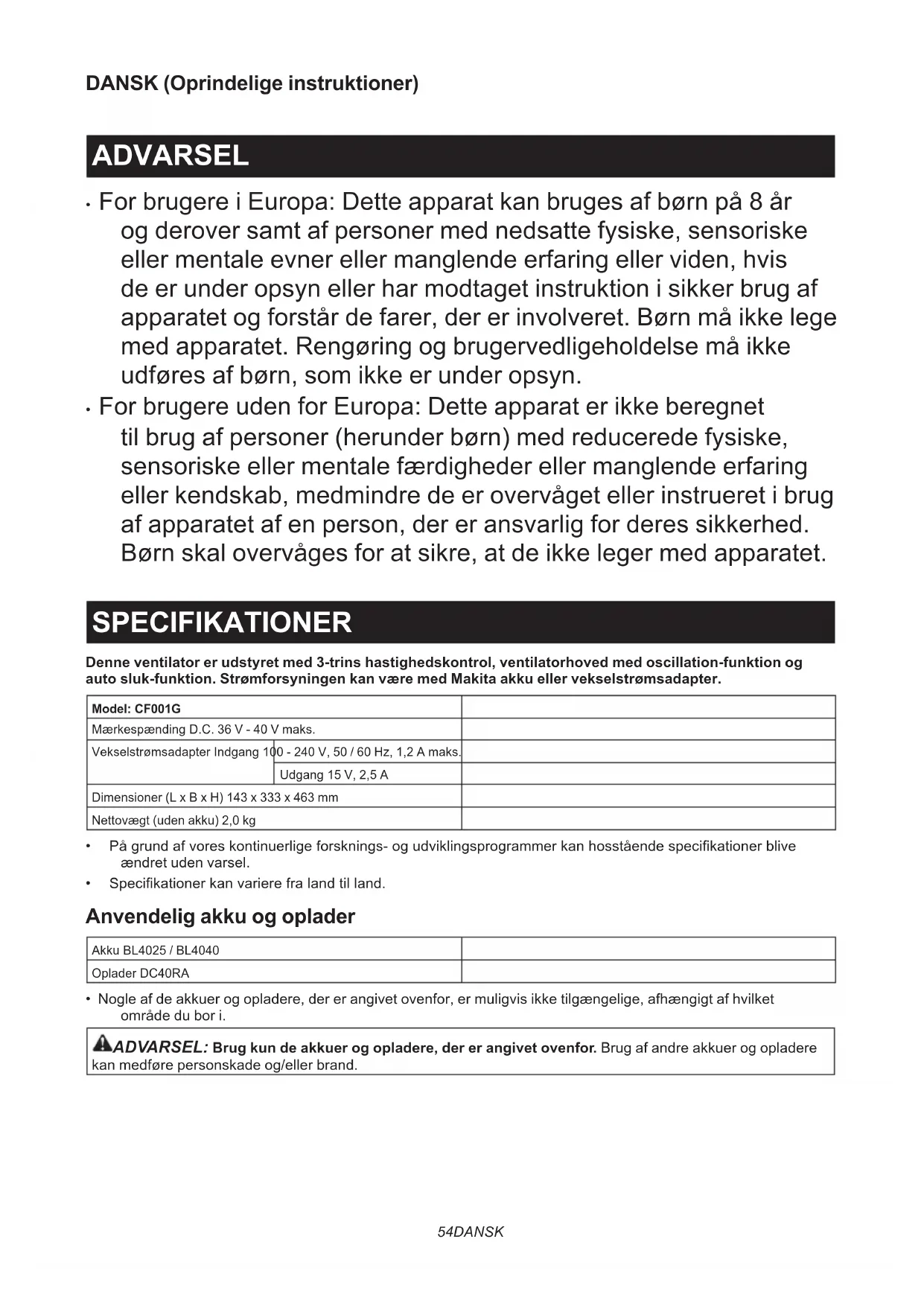 - For brugere uden for Europa: Dette apparat er ikke beregnet til brug af personer (herunder børn) med reducerede fysiske, sensoriske eller mentale færdigheder eller manglende erfaring eller kendskab, medmindre de er overvåget eller instrueret i brug af apparatet af en person, der er ansvarlig for deres sikkerhed. Børn skal overvåges for at sikre, at de ikke leger med apparatet. SPECIFIKATIONER Denne ventilator er udstyret med 3-trins hastighedskontrol, ventilatorhoved med oscillation-funktion og auto sluk-funktion. Strømforsyningen kan være med Makita akku eller vekselstrømsadapter. Model: CF001GMærkespænding D.C. 36 V - 40 V maks.Vekselstrømsadapter Indgang 100 - 240 V, 50 / 60 Hz, 1,2 A maks.Udgang 15 V, 2,5 ADimensioner (L x B x H) 143 x 333 x 463 mmNettovægt (uden akku) 2,0 kg