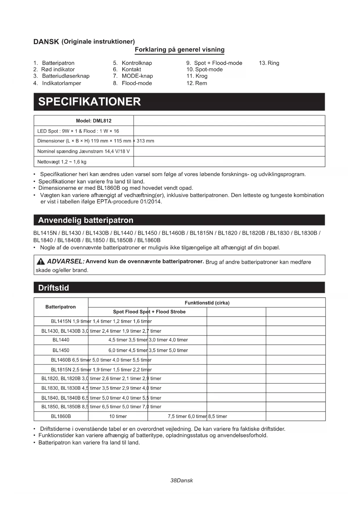 - Funktionstider kan variere afhængig af batteritype, opladningsstatus og anvendelsesforhold.