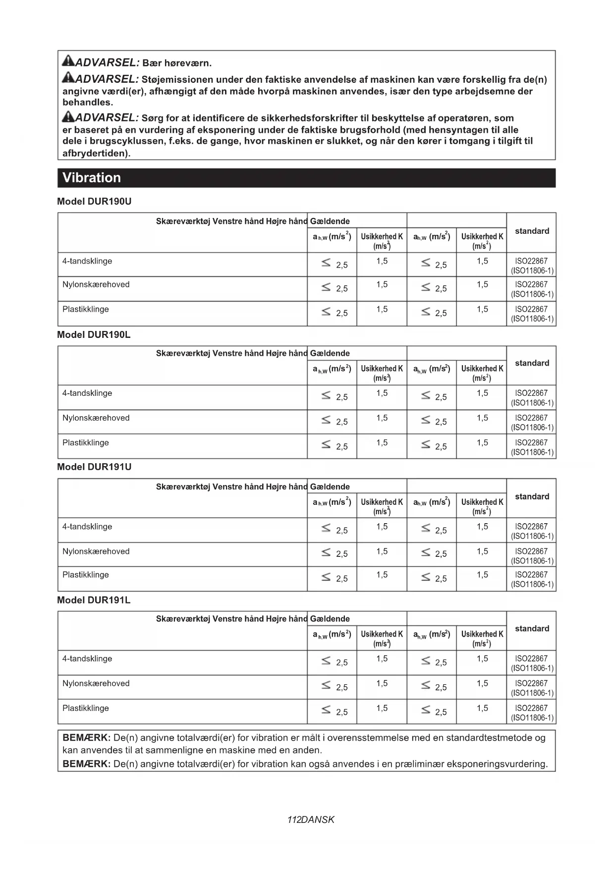 - Selvomdetlydtrykniveau,dererangivetovenfor,er80dB(A)ellerderunder,kanniveauetunderarbejdet overskride 80 dB (A). Bær høreværn. BEMÆRK:De(n)angivnestøjemissionsværdi(er)ermåltioverensstemmelsemedenstandardtestmetodeogkan anvendes til at sammenligne en maskine med en anden. BEMÆRK:De(n)angivnestøjemissionsværdi(er)kanogsåanvendesienpræliminæreksponeringsvurdering.112 DANSK ADVARSEL: Bær høreværn. ADVARSEL: Støjemissionen under den faktiske anvendelse af maskinen kan være forskellig fra de(n) angivne værdi(er), afhængigt af den måde hvorpå maskinen anvendes, især den type arbejdsemne der behandles. ADVARSEL: Sørg for at identicere de sikkerhedsforskrifter til beskyttelse af operatøren, som er baseret på en vurdering af eksponering under de faktiske brugsforhold (med hensyntagen til alle dele i brugscyklussen, f.eks. de gange, hvor maskinen er slukket, og når den kører i tomgang i tilgift til afbrydertiden). Vibration Model DUR190U Skæreværktøj Venstre hånd Højre hånd Gældende standard