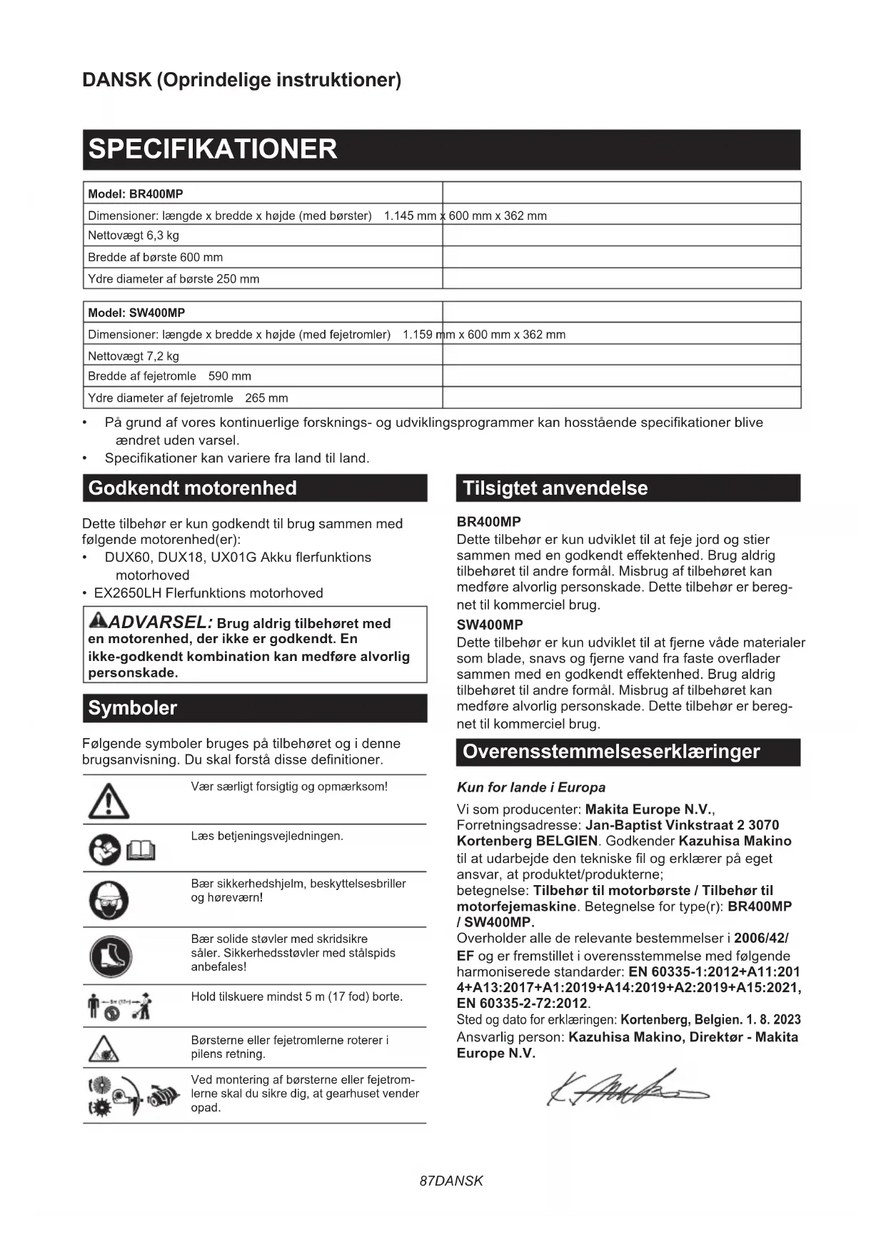 - EX2650LH Flerfunktions motorhoved ADVARSEL: Brug aldrig tilbehøret med en motorenhed, der ikke er godkendt. En ikke-godkendt kombination kan medføre alvorlig personskade. Symboler Følgendesymbolerbrugespåtilbehøretogidenne brugsanvisning.Duskalforstådissedenitioner. Vær særligt forsigtig og opmærksom! Læsbetjeningsvejledningen. Bærsikkerhedshjelm,beskyttelsesbriller og høreværn! Bær solide støvler med skridsikre såler. Sikkerhedsstøvler med stålspids anbefales! Hold tilskuere mindst 5 m (17 fod) borte. Børsterneellerfejetromlernerotereri pilens retning. Vedmonteringafbørsterneellerfejetrom- lerne skal du sikre dig, at gearhuset vender opad. Tilsigtet anvendelse BR400MP Dettetilbehørerkunudviklettilatfejejordogstier sammenmedengodkendteektenhed.Brugaldrig tilbehøret til andre formål. Misbrug af tilbehøret kan medføre alvorlig personskade. Dette tilbehør er bereg- net til kommerciel brug. SW400MP Dettetilbehørerkunudviklettilatfjernevådematerialer somblade,snavsogfjernevandfrafasteoverader sammenmedengodkendteektenhed.Brugaldrig tilbehøret til andre formål. Misbrug af tilbehøret kan medføre alvorlig personskade. Dette tilbehør er bereg- net til kommerciel brug. Overensstemmelseserklæringer Kun for lande i Europa Vi som producenter: Makita Europe N.V., Forretningsadresse: Jan-Baptist Vinkstraat 2 3070 Kortenberg BELGIEN. Godkender Kazuhisa Makino tilatudarbejdedentekniskelogerklærerpåeget ansvar,atproduktet/produkterne; betegnelse: Tilbehør til motorbørste / Tilbehør til motorfejemaskine.Betegnelsefortype(r):BR400MP / SW400MP. Overholder alle de relevante bestemmelser i 2006/42/ EF og er fremstillet i overensstemmelse med følgende harmoniserede standarder: EN 60335-1:2012+A11:201 4+A13:2017+A1:2019+A14:2019+A2:2019+A15:2021, EN 60335-2-72:2012. Sted og dato for erklæringen: Kortenberg, Belgien. 1. 8. 2023 Ansvarlig person: Kazuhisa Makino, Direktør - Makita Europe N.V.88 DANSK SIKKERHEDSADVARSLER Sikkerhedsadvarsler for motorbørste/motorfejemaskine ADVARSEL: Læs alle sikkerhedsadvarsler, instruktioner, illustrationer og specikationer, der følger med denne maskine, samt brugsanvis- ningen til eektenheden før brugen. Manglende overholdelse af alle nedenstående instruktioner kan medførebrandog/elleralvorligpersonskadefor operatørenog/ellertilskuerne. Gem alle advarsler og instruktio- ner til senere reference. Ordene“motorbørste/motorfejemaskine”og“maskine”i advarslerne og forholdsreglerne refererer til kombinatio- nenaftilbehøretogeektenheden. Ordet“motor”iadvarslerneogforholdsreglerne refererer til motoren eller den elektriske motor i motorenheden. Generel sikkerhed