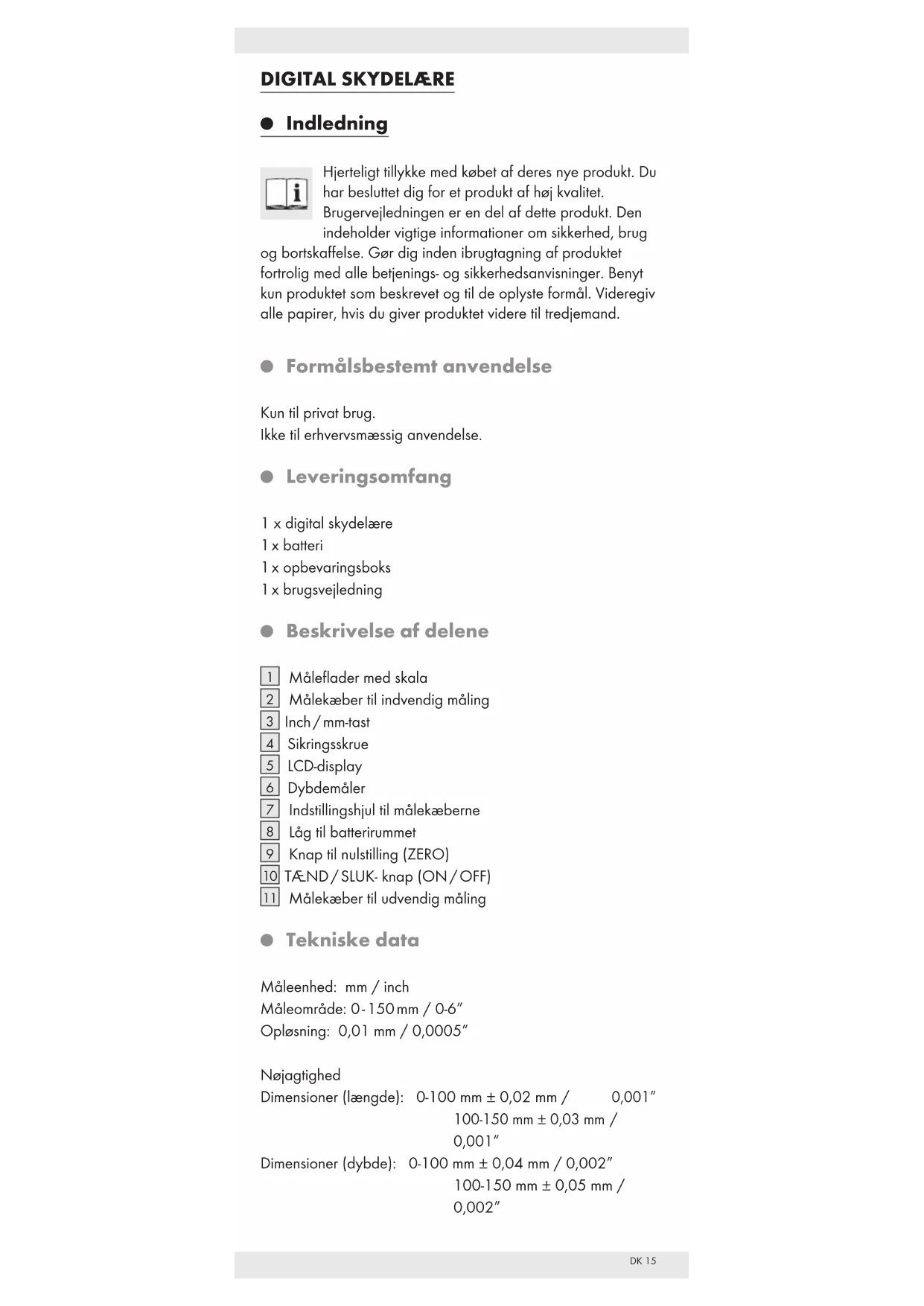 0,001” Dimensioner (dybde): 0-100 mm ± 0,04 mm / 0,002” 100-150 mm ± 0,05 mm / 0,002”DK16 Maksimal Målehastighed: 1,5 m / s, 60”/s Målesystem: lineært, uden kontakt CAP-målesystem Display: LCD-display Driftstemperatur: +5 °C - +40 °C Indflydelse fra luftfugtighed: mellem 0 % og 80 % relativ luftfugtighed ubetydelig Batteri: 3 V CR2032 (er inklusiv i leveringsomfanget) Sikkerhedsregler