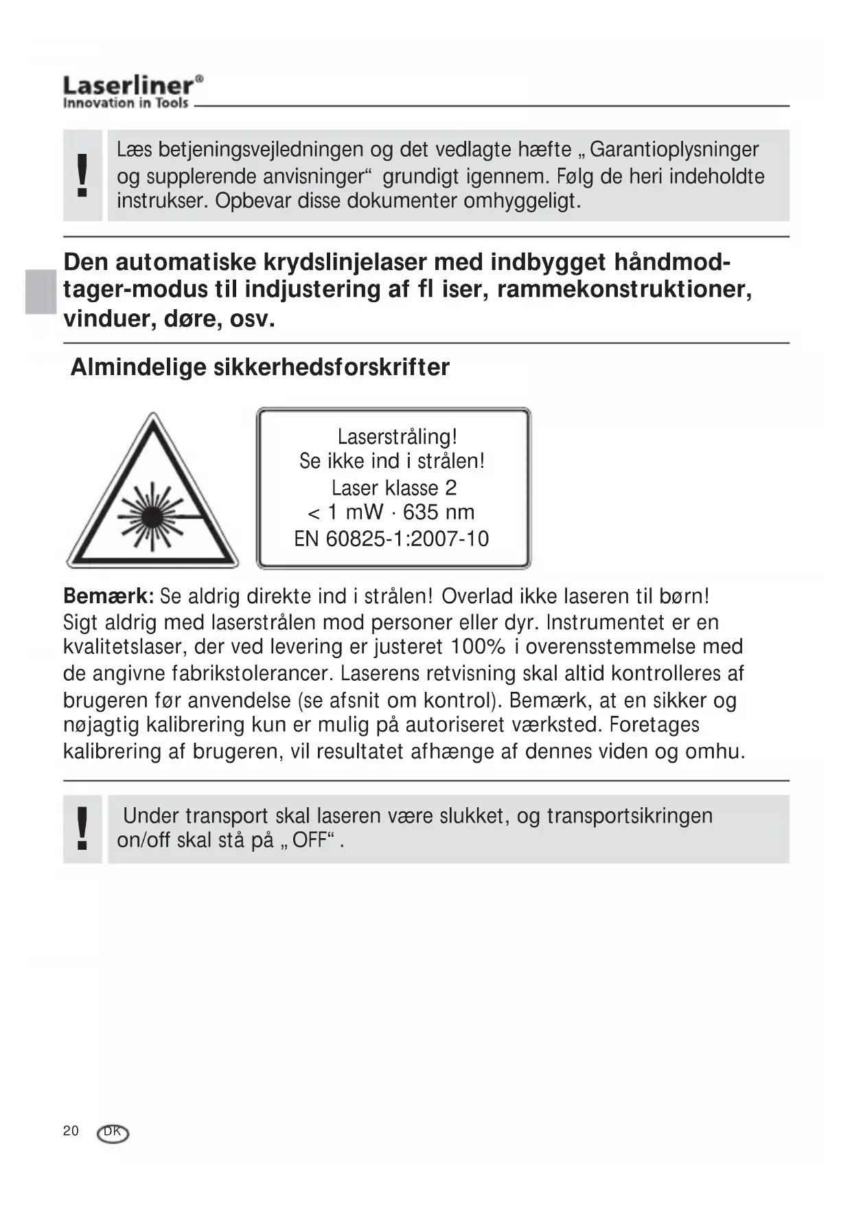 Den automatiske krydslinjelaser med indbygget håndmod- tager-modus til indjustering af ƃ iser, rammekonstruktioner, vinduer, døre, osv. Almindelige sikkerhedsforskrifter Bemærk: Se aldrig direkte ind i strålen! Overlad ikke laseren til børn! Sigt aldrig med laserstrålen mod personer eller dyr. Instrumentet er en kvalitetslaser, der ved levering er justeret 100% i overensstemmelse med de angivne fabrikstolerancer. Laserens retvisning skal altid kontrolleres af brugeren før anvendelse (se afsnit om kontrol). Bemærk, at en sikker og nøjagtig kalibrering kun er mulig på autoriseret værksted. Foretages kalibrering af brugeren, vil resultatet afhænge af dennes viden og omhu. Laserstråling! Se ikke ind i strålen! Laser klasse 2 < 1 mW · 635 nm EN 60825-1:2007-10 Under transport skal laseren være slukket, og transportsikringen on/off skal stå på „OFF“.
