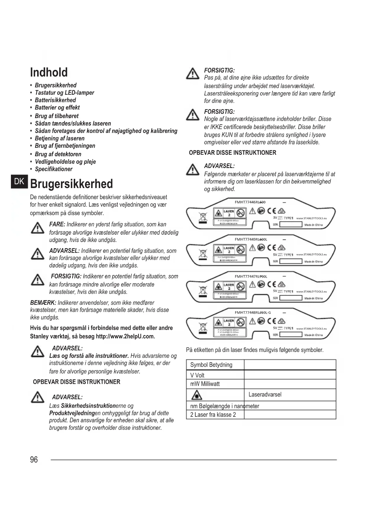 ADVARSEL: Læs Sikkerhedsinstruktionerne og Produktvejledningen omhyggeligt før brug af dette produkt. Den ansvarlige for enheden skal sikre, at alle brugere forstår og overholder disse instruktioner. FORSIGTIG: Pas på, at dine øjne ikke udsættes for direkte laserstråling under arbejdet med laserværktøjet. Laserstråleeksponering over længere tid kan være farligt for dine øjne. FORSIGTIG: Nogle af laserværktøjssættene indeholder briller. Disse er IKKE certicerede beskyttelsesbriller. Disse briller bruges KUN til at forbedre strålens synlighed i lysere omgivelser eller ved større afstande fra laserkilde.