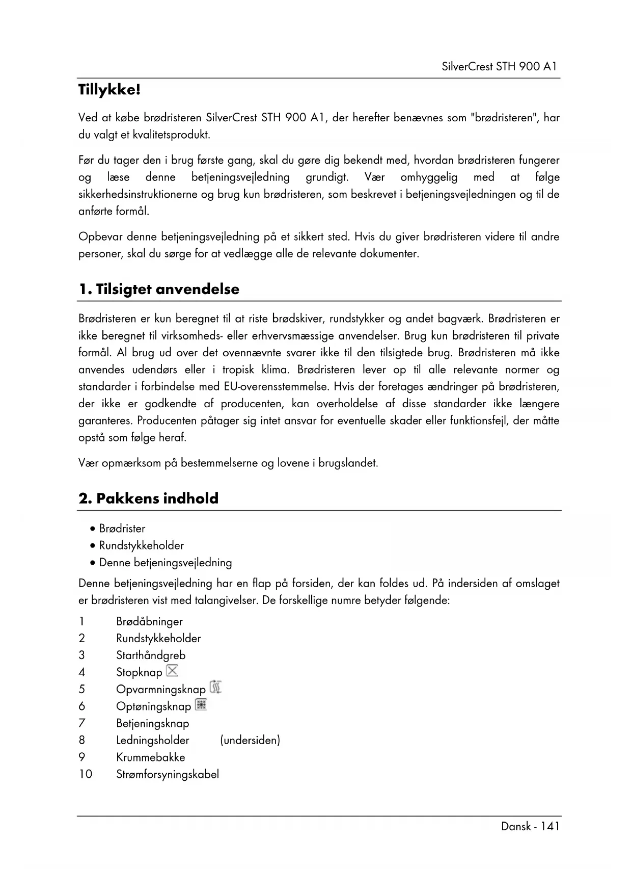 14. Garanti- og serviceoplysninger ................................................................. 155SilverCrest STH 900 A1 Dansk - 141 Tillykke! Ved at købe brødristeren SilverCrest STH 900 A1, der herefter benævnes som "brødristeren", har du valgt et kvalitetsprodukt. Før du tager den i brug første gang, skal du gøre dig bekendt med, hvordan brødristeren fungerer og læse denne betjeningsvejledning grundigt. Vær omhyggelig med at følge sikkerhedsinstruktionerne og brug kun brødristeren, som beskrevet i betjeningsvejledningen og til de anførte formål. Opbevar denne betjeningsvejledning på et sikkert sted. Hvis du giver brødristeren videre til andre personer, skal du sørge for at vedlægge alle de relevante dokumenter.