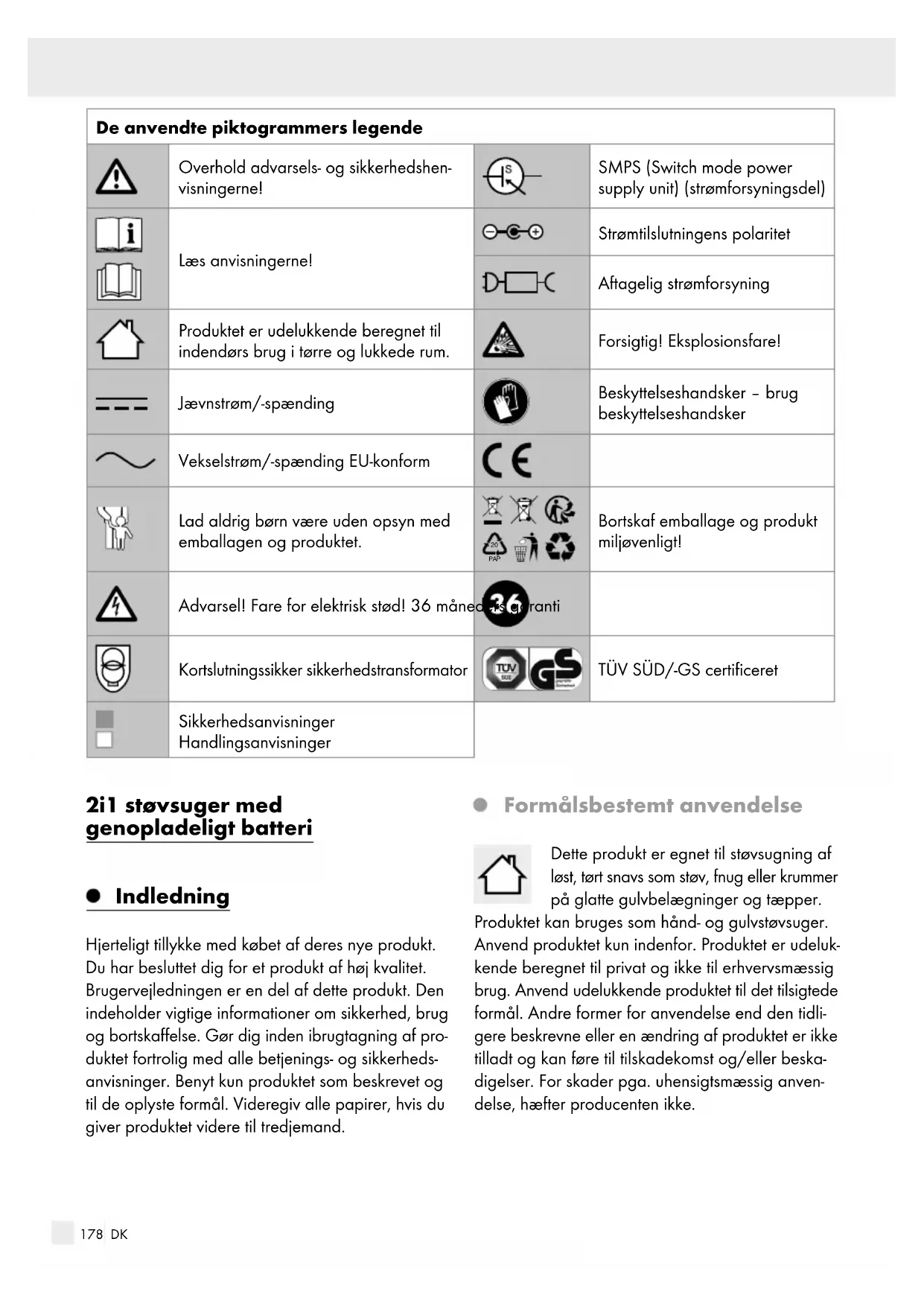 PAP Bortskaf emballage og produkt miljøvenligt! Advarsel! Fare for elektrisk stød! 36 måneders garanti Kortslutningssikker sikkerhedstransformator TÜV SÜD/-GS certificeret Sikkerhedsanvisninger Handlingsanvisninger 2i1 støvsuger med genopladeligt batteri Indledning Hjerteligt tillykke med købet af deres nye produkt. Du har besluttet dig for et produkt af høj kvalitet. Brugervejledningen er en del af dette produkt. Den indeholder vigtige informationer om sikkerhed, brug og bortskaffelse. Gør dig inden ibrugtagning af pro- duktet fortrolig med alle betjenings- og sikkerheds- anvisninger. Benyt kun produktet som beskrevet og til de oplyste formål. Videregiv alle papirer, hvis du giver produktet videre til tredjemand. Formålsbestemt anvendelse Dette produkt er egnet til støvsugning af løst, tørt snavs som støv, fnug eller krummer på glatte gulvbelægninger og tæpper. Produktet kan bruges som hånd- og gulvstøvsuger. Anvend produktet kun indenfor. Produktet er udeluk- kende beregnet til privat og ikke til erhvervsmæssig brug. Anvend udelukkende produktet til det tilsigtede formål. Andre former for anvendelse end den tidli- gere beskrevne eller en ændring af produktet er ikke tilladt og kan føre til tilskadekomst og/eller beska- digelser. For skader pga. uhensigtsmæssig anven- delse, hæfter producenten ikke.179 DK Beskrivelse af de enkelte dele