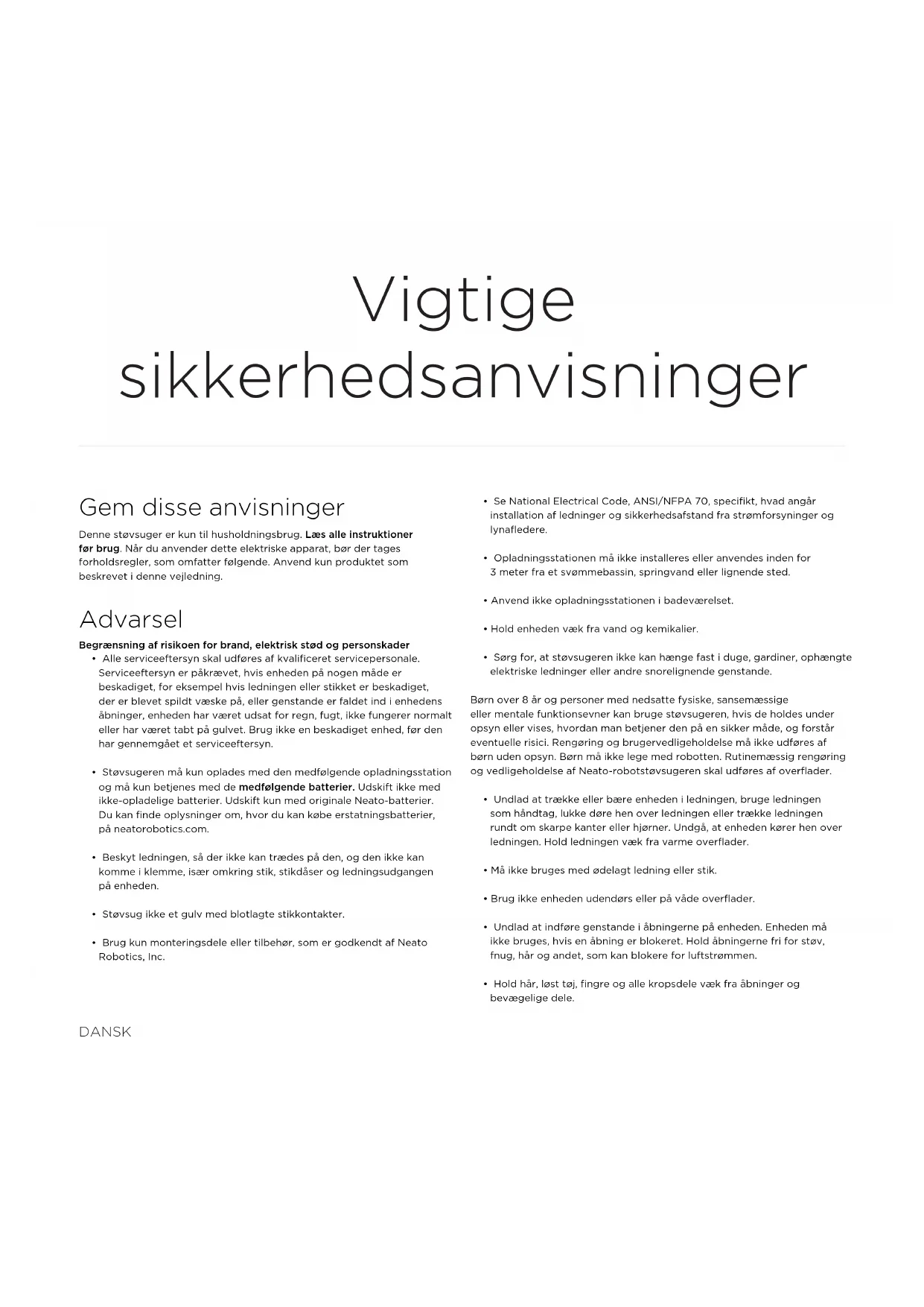 - Sørg for, at støvsugeren ikke kan hænge fast i duge, gardiner, ophængte elektriske ledninger eller andre snorelignende genstande. Børn over 8år og personer med nedsatte fysiske, sansemæssige eller mentale funktionsevner kan bruge støvsugeren, hvis de holdes under opsyn eller vises, hvordan man betjener den på en sikker måde, og forstår eventuelle risici. Rengøring og brugervedligeholdelse må ikke udføres af børn uden opsyn. Børn må ikke lege med robotten. Rutinemæssig rengøring og vedligeholdelse af Neato-robotstøvsugeren skal udføres af overflader.