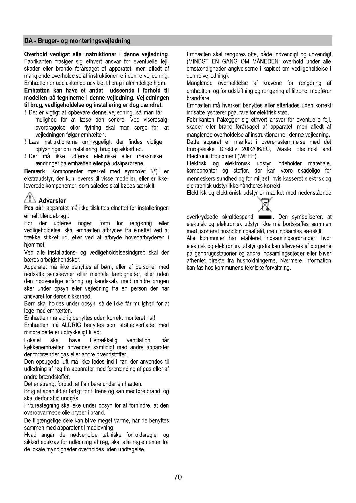 I det fall belysningen inte fungerar, kontrollera att lamporna är korrekt iskruvade i sitt säte innan ni kontaktar det tekniska servicekontoret.70 DA - Bruger- og monteringsvejledning Overhold venligst alle instruktioner i denne vejledning. Fabrikanten frasiger sig ethvert ansvar for eventuelle fejl, skader eller brande forårsaget af apparatet, men afledt af manglende overholdelse af instruktionerne i denne vejledning. Emhætten er udelukkende udviklet til brug i almindelige hjem. Emhætten kan have et andet udseende i forhold til modellen på tegninerne i denne vejledning. Vejledningen til brug, vedligeholdelse og installering er dog uændret. ! Det er vigtigt at opbevare denne vejledning, så man får mulighed for at læse den senere. Ved viseresalg, overdragelse eller flytning skal man sørge for, at vejledningen følger emhætten. ! Læs instruktionerne omhyggeligt: der findes vigtige oplysninger om installering, brug og sikkerhed. ! Der må ikke udføres elektriske eller mekaniske ændringer på emhætten eller på udslipsrørene. Bemærk: Komponenter mærket med symbolet “(*)” er ekstraudstyr, der kun leveres til visse modeller, eller er ikke- leverede komponenter, som således skal købes særskilt. Advarsler Pas på!: apparatet må ikke tilsluttes elnettet før installeringen er helt tilendebragt. Før der udføres nogen form for rengøring eller vedligeholdelse, skal emhætten afbrydes fra elnettet ved at trække stikket ud, eller ved at afbryde hovedafbryderen i hjemmet. Ved alle installations- og vedligeholdelsesindgreb skal der bæres arbejdshandsker. Apparatet må ikke benyttes af børn, eller af personer med nedsatte sanseevner eller mentale færdigheder, eller uden den nødvendige erfaring og kendskab, med mindre brugen sker under opsyn eller vejledning fra en person der har ansvaret for deres sikkerhed. Børn skal holdes under opsyn, så de ikke får mulighed for at lege med emhætten. Emhætten må aldrig benyttes uden korrekt monteret rist! Emhætten må ALDRIG benyttes som støtteoverflade, med mindre dette er udtrykkeligt tilladt. Lokalet skal have tilstrækkelig ventilation, når køkkenemhætten anvendes samtidigt med andre apparater der forbrænder gas eller andre brændstoffer. Den opsugede luft må ikke ledes ind i rør, der anvendes til udledning af røg fra apparater med forbrænding af gas eller af andre brændstoffer. Det er strengt forbudt at flambere under emhætten. Brug af åben ild er farligt for filtrene og kan medføre brand, og skal derfor altid undgås. Friturestegning skal ske under opsyn for at forhindre, at den overopvarmede olie bryder i brand. De tilgængelige dele kan blive meget varme, når de benyttes sammen med apparater til madlavning. Hvad angår de nødvendige tekniske forholdsregler og sikkerhedskrav for udledning af røg, skal alle reglementer fra de lokale myndigheder overholdes uden undtagelse. Emhætten skal rengøres ofte, både indvendigt og udvendigt (MINDST EN GANG OM MÅNEDEN; overhold under alle omstændigheder angivelserne i kapitlet om vedligeholdelse i denne vejledning). Manglende overholdelse af kravene for rengøring af emhætten, og for udskiftning og rengøring af filtrene, medfører brandfare. Emhætten må hverken benyttes eller efterlades uden korrekt indsatte lyspærer pga. fare for elektrisk stød. Fabrikanten fralægger sig ethvert ansvar for eventuelle fejl, skader eller brand forårsaget af apparatet, men afledt af manglende overholdelse af instruktionerne i denne vejledning. Dette apparat er mærket i overensstemmelse med det Europæiske Direktiv 2002/96/EC, Waste Electrical and Electronic Equipment (WEEE). Elektrisk og elektronisk udstyr indeholder materiale, komponenter og stoffer, der kan være skadelige for menneskers sundhed og for miljøet, hvis kasseret elektrisk og elektronisk udstyr ikke håndteres korrekt. Elektrisk og elektronisk udstyr er mærket med nedenstående overkrydsede skraldespand . Den symboliserer, at elektrisk og elektronisk udstyr ikke må bortskaffes sammen med usorteret husholdningsaffald, men indsamles særskilt. Alle kommuner har etableret indsamlingsordninger, hvor elektrisk og elektronisk udstyr gratis kan afleveres af borgerne på genbrugsstationer og andre indsamlingssteder eller bliver afhentet direkte fra husholdningerne. Nærmere information kan fås hos kommunens tekniske forvaltning.71 Brug Emhætten er udviklet til brug i den sugende udgave med ekstern udledning eller i den filtrerende udgave med intern recirkulation. Sugende udgave Dampen ledes udenfor vha. et aftræksrør fastgjort til samleflangen. Aftræksrørets diameter skal svare til diameteren på forbindelsesringen. Obs! Udledningsrøret leveres ikke, og skal købes. På den vandrette del skal røret have en let stigning (cirka 10°) for at lette bortledning af luften udenfor lokalet. Hvis emhætten er udstyret med kulfiltre, skal disse filtre fjernes. Tilslut emhætten til aftræksrør og aftrækshullet i væggen, som skal have en diameter, der passer til luftudsugningen (studsflange). Hvis rør og hul har en mindre diameter, forringes udsugningskapaciteten og støjen øges betydeligt. Producenten fralægger sig ethvert ansvar i forbindelse hermed. ! Benyt et rør, der er så kort som muligt. ! Benyt et rør, der har så få kurver som muligt (max. vinkel på kurven: 90°). ! Undgå drastiske ændringer i rørets tværsnit. ! Benyt et rør med så glat en inderside som muligt. ! Rørets materialer skal være godkendt i henhold til reglerne. Filtrerende udgave Den indsugede luft affedtes og lugten fjernes, før luften sendes tilbage i lokalet. For at benytte emhætten i denne udgave skal der monteres et supplerende filtreringssystem baseret på aktivt kul. Installering Minimumsafstanden mellem kogegrejets støtteoverflade på komfuret og den nederste del af emhætten må ikke være under 50cm ved elektriske kogeplader, og ikke under 65cm ved gasblus eller komfurer med både gasblus og elektriske kogeplader. 